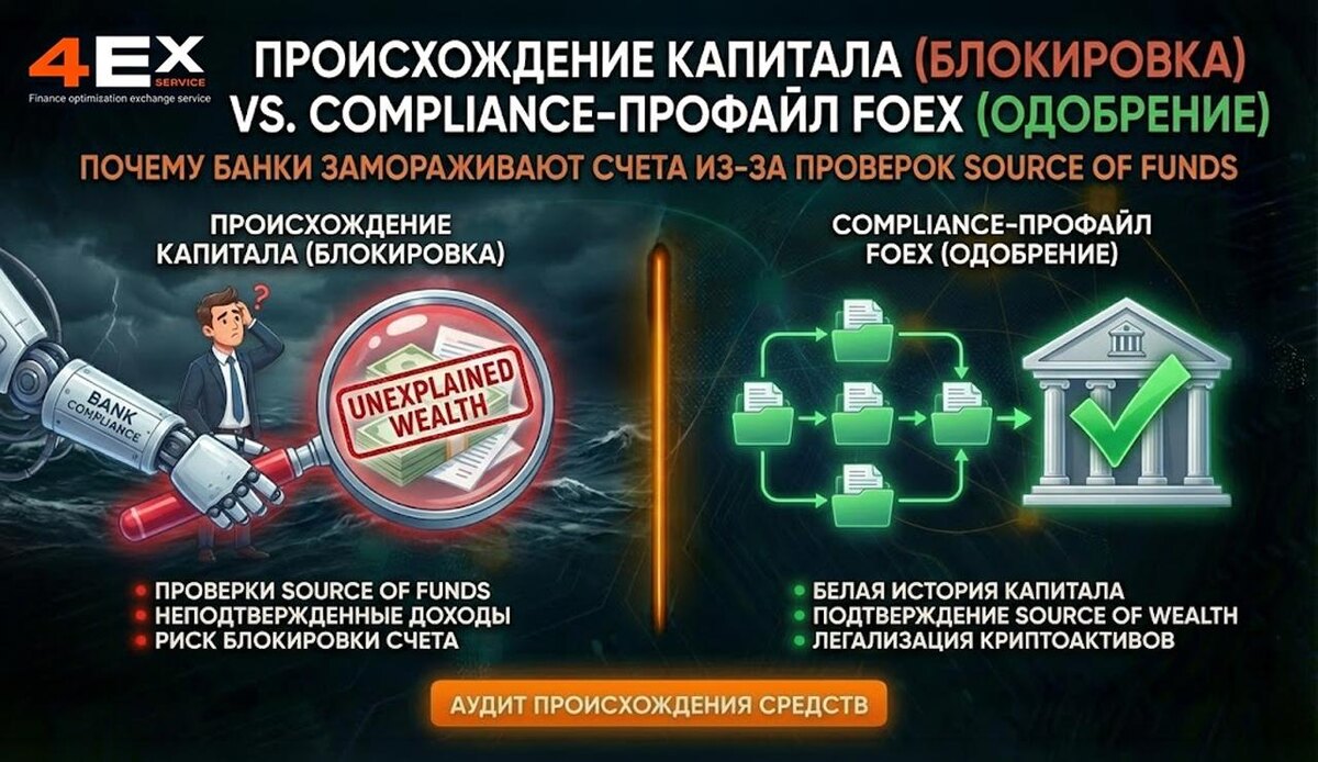 Вы открыли новую компанию в ОАЭ или Гонконге, принесли идеальный инвойс на оплату товара, но комплаенс-офицер внезапно просит вашу личную налоговую декларацию за 2020 год. Сделка «горит», а вы судорожно ищете старые выписки. Знакомая ситуация? Эпоха, когда для проведения платежа хватало только свежего контракта, безвозвратно ушла. Сегодня глобальный банкинг перешел к жесткой проверке Source of Funds (SoF) и Source of Wealth (SoW). 📉 В чем разница и где кроется ловушка для бизнеса? 1️⃣ Source of Funds (Происхождение конкретных средств): Банк больше не верит деньгам, которые «просто появились» на вашем корпоративном счету. Если вы хотите отправить $500k поставщику, комплаенс потребует показать всю цепочку: откуда эти деньги пришли к вам. «Перевод от дружественной компании» без железобетонного договора или экономического смысла больше не пройдет. 2️⃣ Source of Wealth (Происхождение капитала фаундера): Если вы выступаете бенефициаром или инвестором своей компании, банк проверяет лично