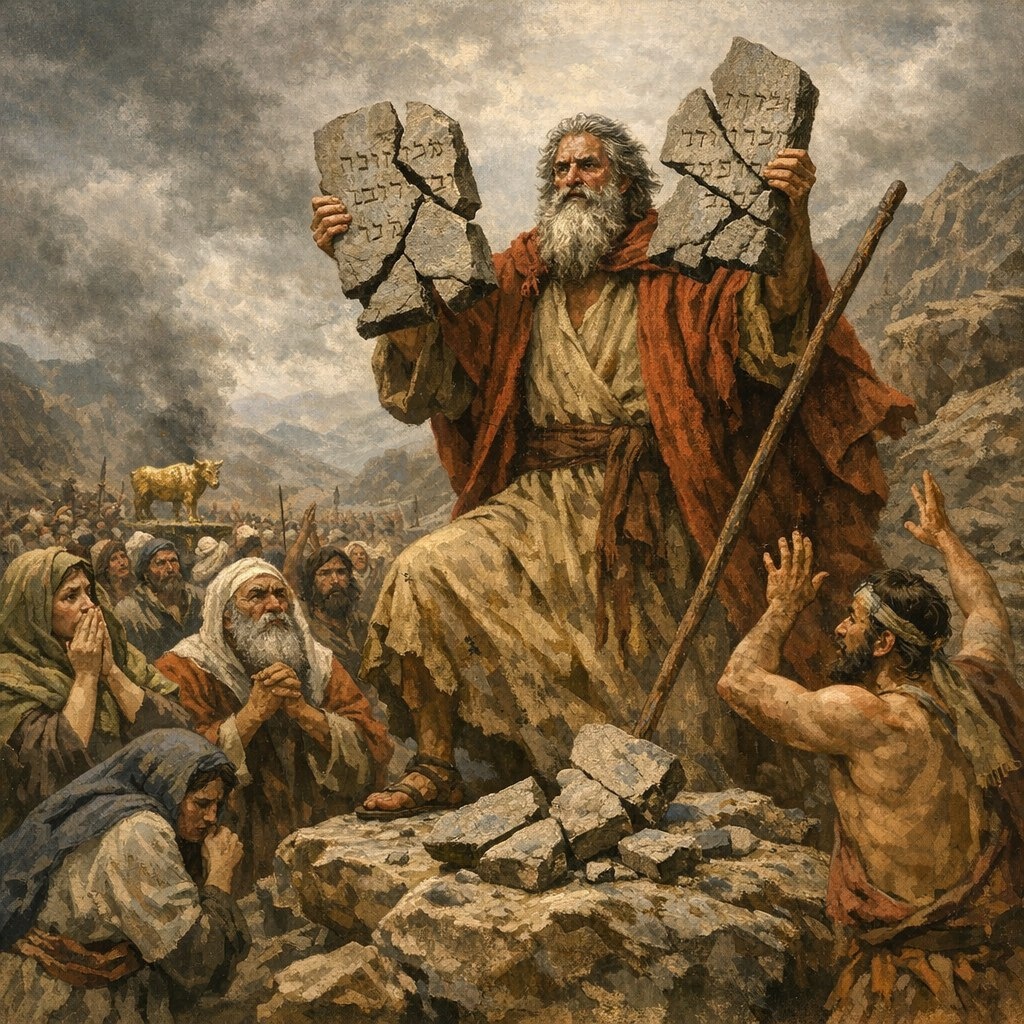 Моисей спускается с горы с двумя скрижалями Закона и видит пляску вокруг тельца. В ответ он разбивает каменные плиты. Это знак: завет нарушен. И всё же история не заканчивается судом. Бог даёт новый шанс — новые скрижали, обновлённый союз.