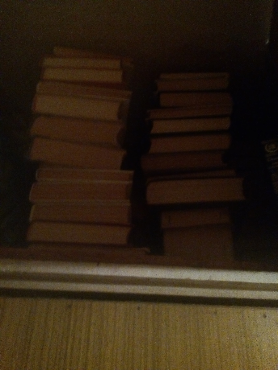 Дома книги делятся на группы. Родителей. Приобретенные мной недавно. Приобретённые мной и сестрой давно. Сейчас пока так: (мало нужные на антресоли) Шкафчик: на верхней полке - дореволюционные, дальше - довоенные, Следующая полка - советские нужные. А это в комоде. Там две полки - в три ряда. Остальное - в кладовке. Верхний шкафчик на секретере... Шнур? А, ну это я в кладловку свет провёл... Под книжной полкой - там всё забито книгами: А слева , там тумбочка, и книги на ней... Тумбочка примыкает к платяному шкафу... Это стопка на тумбочке - альбомы по живописи... Это на шкафу с одеждой стоит антресоль мебельная... А на той антресоли - книжная ролка: Короче надо с этим разбираться. Итак... Цели определены... Задачи поставлены... За работу, товарищи! :0) С понедельника и приступим... Да? пс пока так: 170 книг...Дальний верхний угол кладовки... :0)