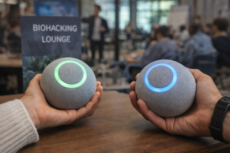 Интересный формат - wellness или био-хакинг лаунжи. В таких зонах участники могут попробовать различные практики управления состоянием. Например, есть такая штука как Reflect Orb. Это биометрический «камень», который считывает биосигналы человека. Когда участник держит его в руках, устройство меняет цвет в зависимости от уровня стресса. Фактически человек видит своё состояние в реальном времени.