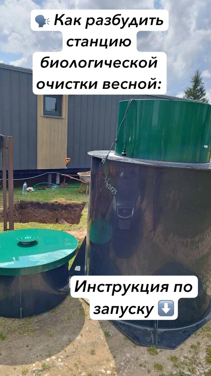 »: 1️⃣Осмотр и ревизия Снимите крышку (утеплитель уже убран?). Проверьте, не попала ли внутрь талая вода, не потрескались ли патрубки от мороза. Убедитесь, что в камерах нет льда. 2️⃣Удаление осадка (если нужно) За зиму на дне мог выпасть неразлагаемый осадок. Если его много (больше 30-40% объема приемной камеры), его лучше откачать ассенизатором или фекальным насосом ДО запуска. 3️⃣Заливка чистой водой Если станция была законсервирована (осушена или законсервирована на зиму), необходимо заполнить все камеры чистой водой до рабочего уровня (обычно до уровня выходной трубы). 4️⃣Подключение и «холостой прогон» Включите питание и компрессор. Станция должна поработать вхолостую на чистой воде хотя бы 20-30 минут. Проверьте, как работают эрлифты (поднимается ли вода), есть ли циркуляция. 5️⃣Запуск бактерий — САМЫЙ ВАЖНЫЙ ЭТАП Внесите стартовую дозу «живых» бактерий. 6️⃣Режим «Покой» Первые 2-3 недели старайтесь не нагружать станцию «тяжелой артиллерией» (агрессивная химия, хлорка, мар