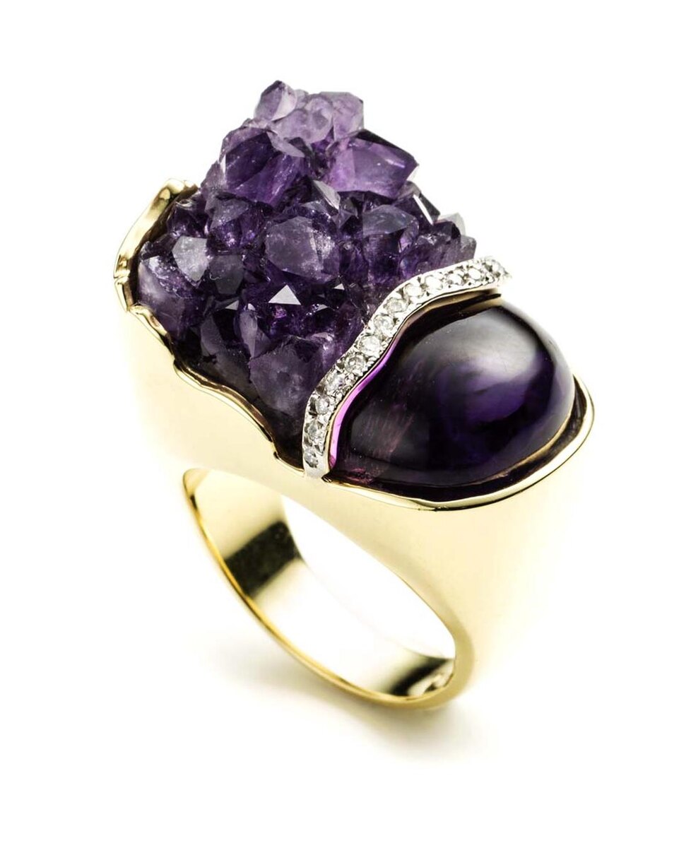 Покорив вас цифровыми эскизами Кары, я с удовольствием сообщаю, что вживую ее украшения впечатляют еще больше. Совершенно непохожие ни на что, что я видела раньше, они уверенные и стильные, невероятно модные и, прежде всего, интригующие. Кара в мгновение ока показала нам кольцо «Пангея», вращающееся вокруг своей оси, с пятью зигзагообразными элементами, которые соединяются, как детали пазла. «Оно призвано символизировать континенты», — объяснила Кара. «Голубой топаз-кабошон — это мир». Я задержала взгляд на потрясающем кольце с аметистом, в котором доминировал необработанный аметист, возвышающийся над моим пальцем, словно корявая гора, а рядом с ним был вставлен гладкий, отполированный кабошон.