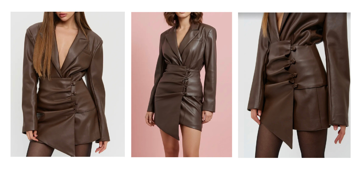 Иногда на маркетплейсах появляются вещи, которые сразу притягивают взгляд. Они выглядят эффектно, немного дерзко и будто обещают сделать образ заметным. Именно такое впечатление производит кожаное платье с баской. На фото модель выглядит очень выразительно: плотный материал, чёткая линия талии и декоративная баска создают скульптурный силуэт. Но если смотреть на вещь глазами стилиста, возникает важный вопрос — насколько это платье действительно современно и носибельно. Кожаные платья уже несколько сезонов остаются заметным элементом моды. Особенно популярна эко-кожа в глубоких оттенках: шоколадный, тёмный карамельный, винный. Такие цвета выглядят гораздо дороже, чем классический чёрный глянец. Если материал действительно плотный и матовый, платье может смотреться очень эффектно и дорого. Но именно с кожаными вещами есть главный риск маркетплейсов: слишком блестящая или тонкая экокожа сразу удешевляет образ. Баска — это декоративная деталь, которая расширяется от линии талии и создаёт д