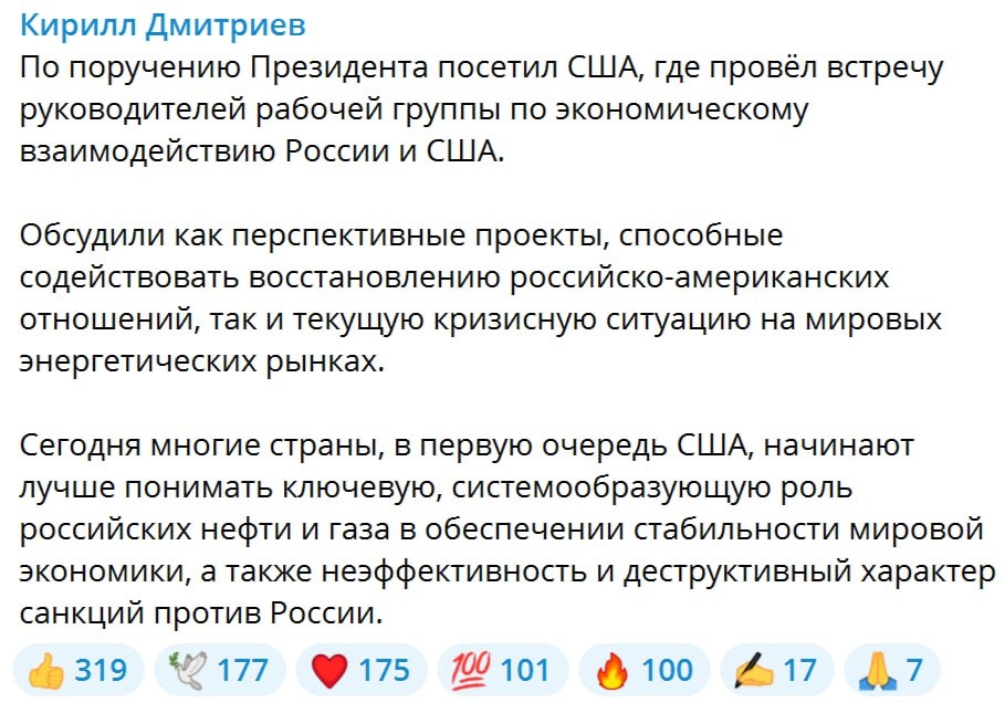 Кирилл Дмитриев летал в Майями на встречу с американской стороной, сообщает, что обсуждал перспективные проекты, способные содействовать