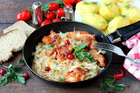 Курица с квашеной капустой — это не просто вкусно, а очень вкусно и удачно! Сочетание действительно отличное: кислинка капусты делает мясо невероятно сочным и мягким, а жир из курицы, в свою очередь, смягчает капусту, делая её вкус более глубоким и насыщенным . Это сытное и ароматное блюдо, которое готовится довольно просто . Вот несколько проверенных способов, как его приготовить, от самых простых до более праздничных. 🔥 Способ 1: Классическое тушение в кастрюле или казане Это самый популярный и простой вариант для ужина в кругу семьи. Всё готовится в одной посуде и практически само себя делает . · Ингредиенты: Курица (любые части), квашеная капуста, лук, морковь, томатная паста, соль, перец, лавровый лист . · Как готовить: 1. Обжарьте лук с морковью до золотистого цвета. 2. Добавьте кусочки курицы и обжаривайте их до корочки. 3. Положите томатную пасту, перемешайте и прогрейте минуту. 4. Залейте водой так, чтобы она почти покрывала курицу. Посолите, поперчите, добавьте лавровый ли