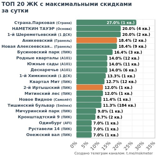 🟩 Честные скидки: 39 ЖК (348 кв.) 🟧 Маркетинг скидки: 12 ЖК (106 кв.) 💎 МАКСИМАЛЬНАЯ ЭКОНОМИЯ 🏆 Sminex • Тишинский бульвар ├🔻10.0M → 88.2M • 1-к 69м² ├🔻9.8M → 89.1M • 1-к 69м² └🔻7.5M → 94.0M • 1-к 60м² 🥈 Основа • НАМЕТКИН ТАУЭР └🔻6.4M → 31.8M • 4-к 85м² 🥉 Страна • Страна.Парковая └🔻5.1M → 19.1M • 3-к 78м² 4️⃣ ПИК • Бусиновский парк └🔻4.5M → 27.4M • 3-к 83м² 5️⃣ A101 • Южные сады ├🔻4.4M → 33.8M • 4-к 92м² └🔻2.8M → 20.1M • 3-к 56м² 6️⃣ ПИК • Квартал Мит └🔻3.2M → 26.5M • 3-к 85м² 🔑 САМЫЕ ДОСТУПНЫЕ 🏆 Гранель • Новая Алексеевская роща ├🔻862к → 6.2M • 1-к 34м²❗️ ├🔻870к → 6.2M • 1-к 33м²❗️ └🔻881к → 6.3M • 1-к 35м²❗️ 🥈 1 ДСК • 1-й Шереметьевский ├🔻998к → 7.1M • Студия 28м² └🔻1.4M → 7.2M • Студия 28м² 🥉 A101 • Родные кварталы ├🔻1.1M → 7.6M • Студия 24м²❗️ ├🔻1.1M → 7.7M • Студия 24м² └🔻1.1M → 7.8M • Студия 24м² 4️⃣ Самолёт • Богдановский Лес └🔻242к → 7.9M • 1-к 37м²❗️ ❗️— лоту меньше месяца 👇 Полная статистика: 📲 В Telegram | 🌐 На MskMeter.ru