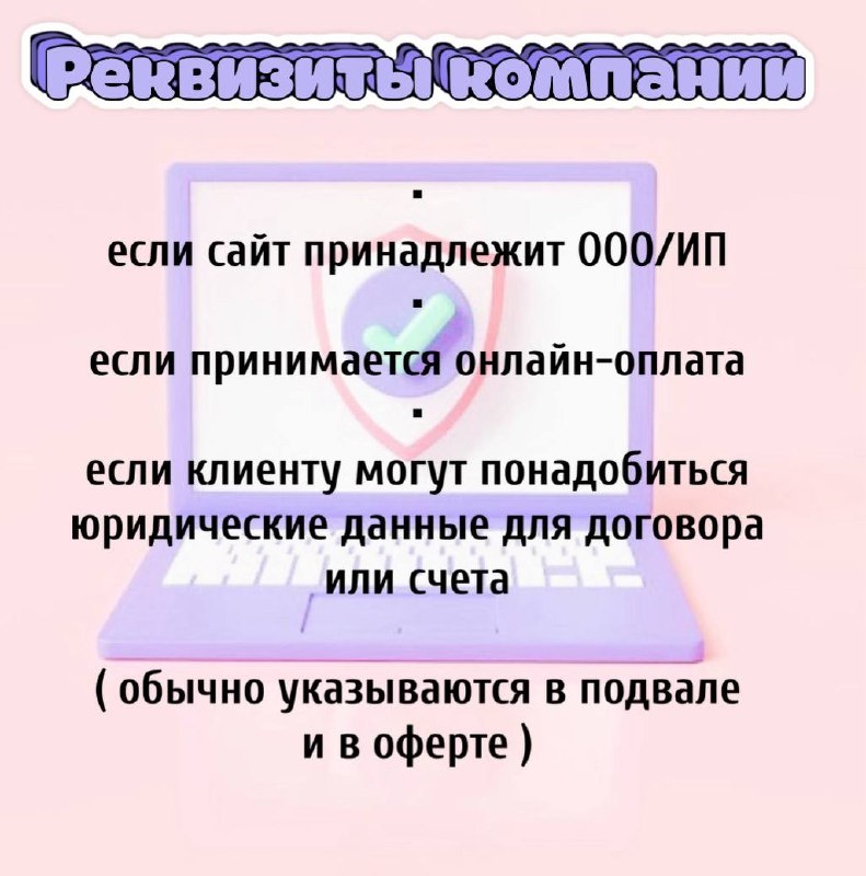 Чтобы сайт работал без рисков и штрафов, мало красивого дизайна. Нужна юридическая база. От неё зависит, сможете ли вы доказать свои права, защитить данные клиентов и спокойно принимать оплату. Мы собрали для вас карточки-шпаргалки — смотрите и проверяйте, всё ли есть на вашем сайте: ✨ Реквизиты компании — в подвале и в оферте. ✨ Политика конфиденциальности — если собираете любые данные (имя, телефон, email). ✨ Публичная оферта — если принимаете онлайн-оплату или оформляете заказы. ✨ Пользовательское соглашение — если есть личный кабинет или пользовательский контент. ✨ Политика cookies — всегда (технически сайты их используют) + если есть аналитика или рекламные пиксели. ✨ Согласие на обработку персональных данных — под каждой формой сбора данных. ✨ Сохраняйте карточки и проверьте свой сайт сегодня. Это займёт 10 минут, но убережёт от претензий и блокировок. ✨ Есть сомнения по вашим документам? ✨ Обсудите в ветке «Цифровой маркетинг и веб-разработка» нашего закрытого чата «БИЗНЕСША