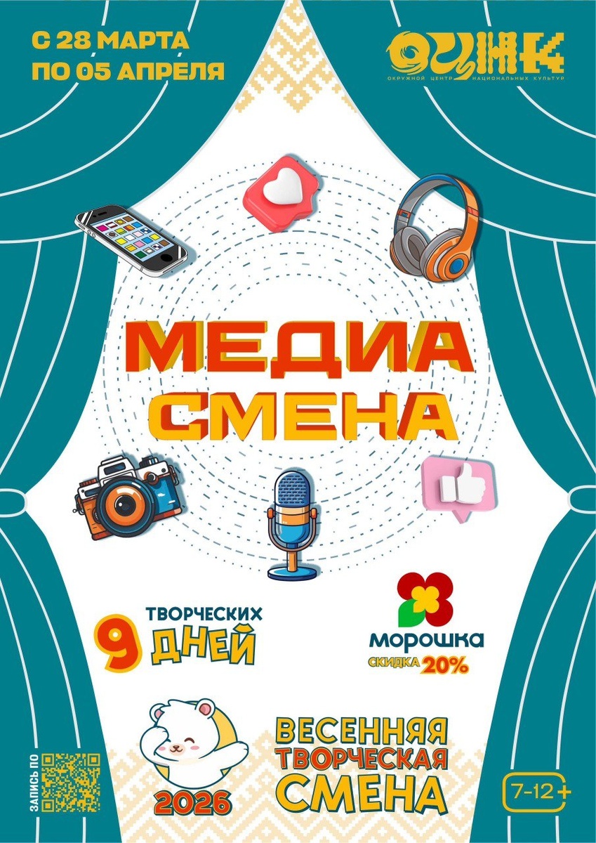 ! С 28 марта по 5 апреля в ОЦНК — МЕДИАСМЕНА для детей 7–12 лет. За 9 дней мы: 📸 раскроем секреты идеального кадра (свет, ракурс, настройки); 🤖 подружимся с нейросетями; 🎙 научим говорить без стеснения; 📱 сделаем первые шаги в монтаже; 🎮 и просто круто проведем время! В конце смены каждый унесет с собой новые знания и кучу классных фото! Оставить заявку можно по ссылке: clck.ru/3SJukA Стоимость участия: — 600 ₽ — один день — 5400 ₽ — полная смена (9 дней) Для держателей карты «Морошка» — скидка 20% 🎁 4 320 ₽ #ОЦНК #Салехард #ТворческаяСмена #Каникулы