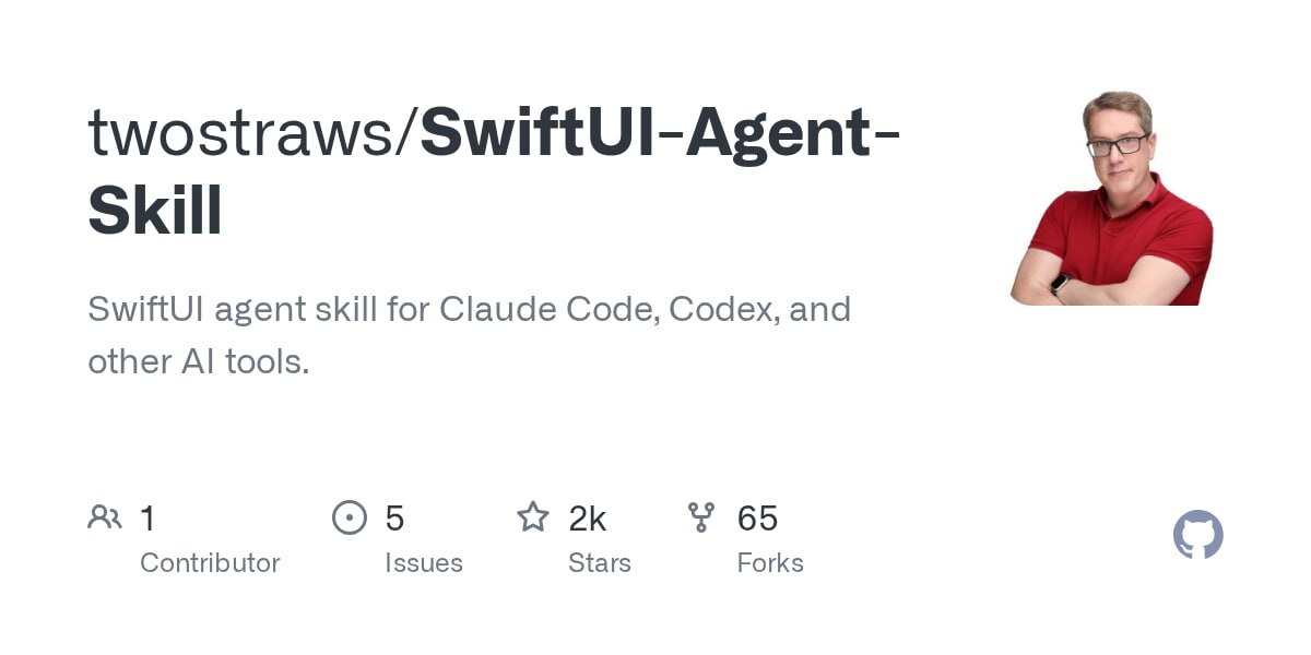 SwiftUI Pro - агентский навык, помогающий ИИ-помощникам писать более умный, простой и современный SwiftUI, с рекомендациями по использованию API, дизайну, производительности и доступности. Охватывает навигацию, компоновку, анимацию, управление состоянием, VoiceOver, устаревшие API и многое другое, ориентируясь на ошибки, которые действительно допускают программисты с большим опытом. Навык основан на рабочем файле AGENTS.md, а это значит, что вы можете привнести многолетний опыт и знания в выбранного вами агента всего за несколько минут. Он использует формат Agent Skills, поэтому бесперебойно работает с Claude Code, Codex, Gemini, Cursor и другими. SwiftUI Pro на GitHub: https://github.com/twostraws/SwiftUI-Agent-Skill Платформа: iOS ⭐️: 2K 👨🦯➡️ AppFiles: код, инструменты, практики, производительность