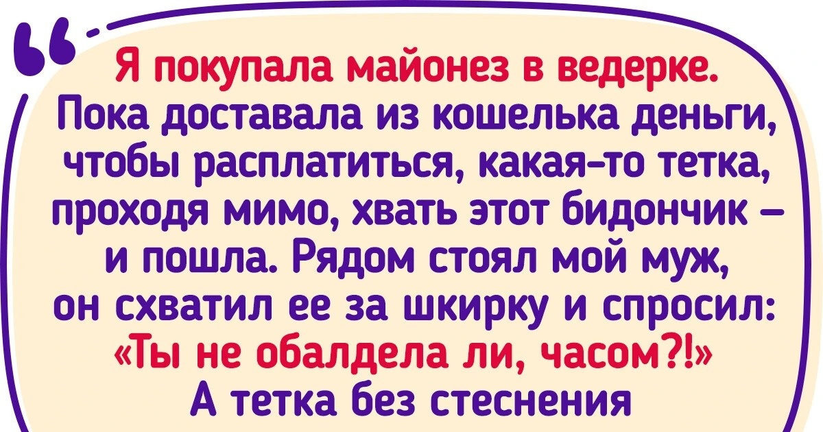 Поход в магазин для большинства людей является обыденностью и не сулит каких-то ярких эмоций. Но иногда между прилавком с картошкой и холодильником с мороженым закипают такие страсти, что бразильские сериалы просто отдыхают. Я покупала майонез в ведерке. Пока доставала из кошелька деньги, чтобы расплатиться, какая-то тетка, проходя мимо, хвать этот бидончик — и пошла. Рядом стоял мой муж, он схватил ее за шкирку и спросил: «Ты не обалдела ли, часом?!» А тетка без стеснения заявила: «Ой, я подумала, что это мое!» — сунула ему в руки майонез и свалила. © Helennae / Pikabu Знакомый красил волосы в темно-русый, потому что не хотел в 35 лет ходить седым. Причем пользовался краской для мужчин. Пришли мы с ним в магазин за краской, спросили у дамы на кассе, есть ли у них такая. Та трижды поморщилась и фыркнула: «У нас мужчины не красятся!» — а потом заявила, что такой краски в природе не существует, и сморщилась еще сильнее. © Anastacinha / Pikabu Лежал с ребенком в больнице. Дочка захотела с