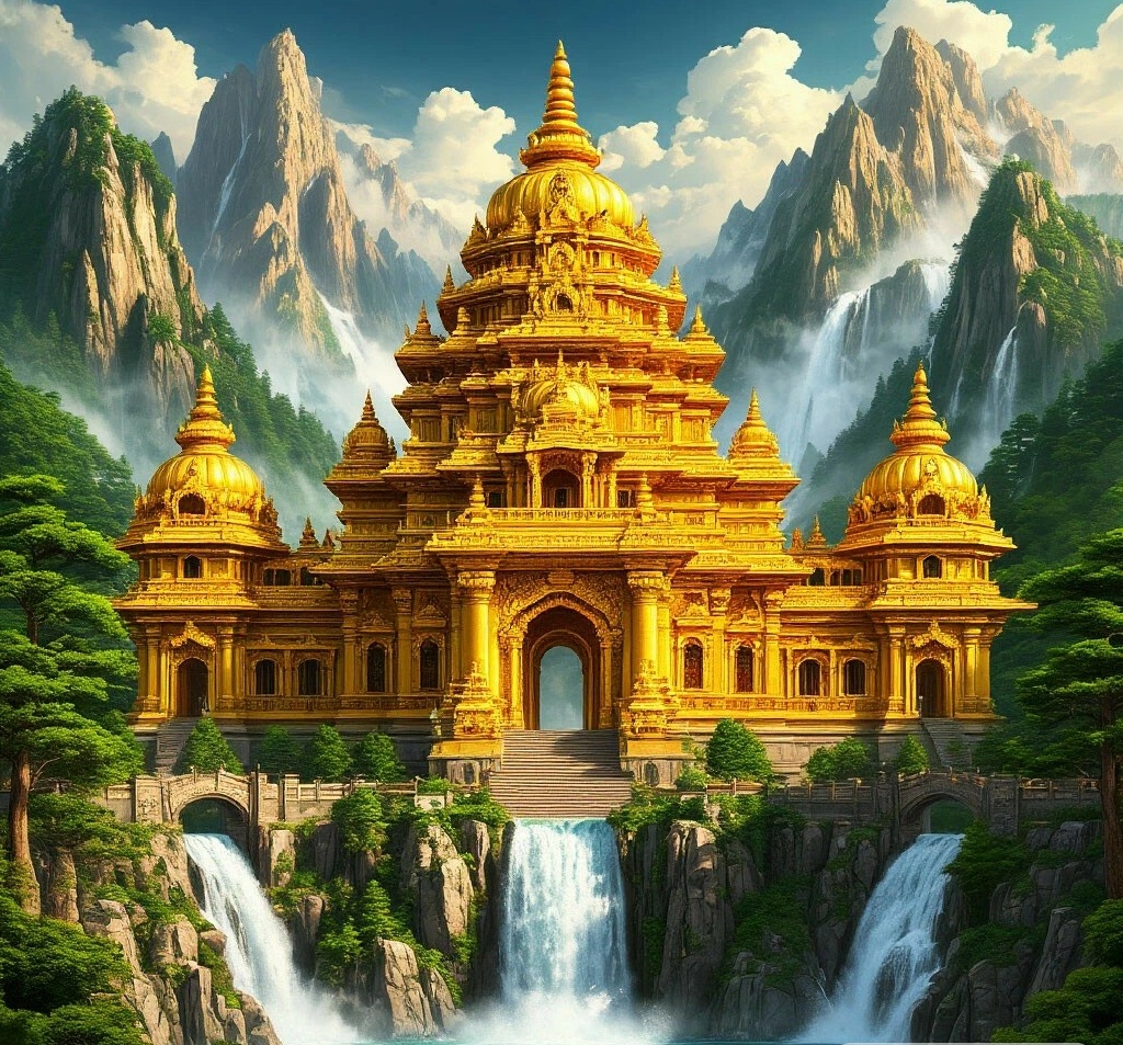 Семиглавый дворец возвышался посреди зелёных холмов. Каждое утро солнце играло яркими лучами на его стенах, покрытых золотом и серебром, украшенных драгоценными камнями и редкими самоцветами. Внутри дворца просторные залы поражали воображение богатством убранства: стены украшены искуснейшими фресками, изображающими сцены побед, героев из древних легенд.