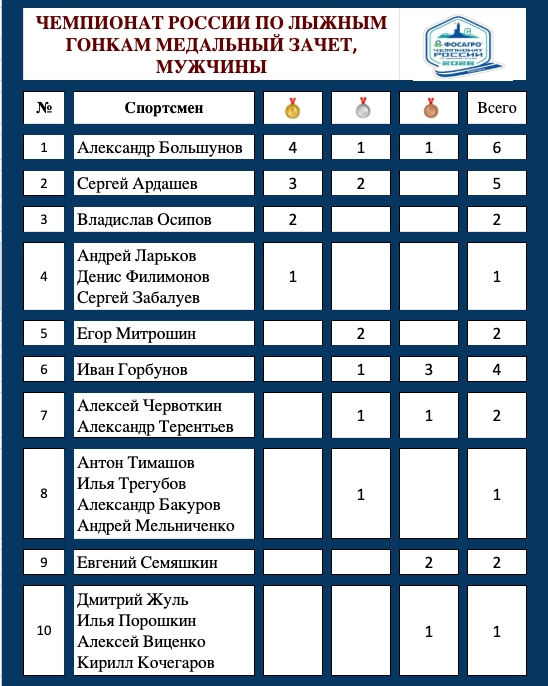 Чемпионат России по лыжным гонкам в Южно-Сахалинске закончился и пора подводить итоги главного турнира всего зимнего сезона 2025/26 года. Главный итог - это полное доминирование команды Татарстана в мужских лыжных гонках. Мужская команда из Казани завоевала ВСЁ золото Чемпионата России во всех видах - разделка 10 км, скиатлон, эстафеты, спринт, командный спринт и марафон! 10 золотых медалей из 10 возможных. Еще мужчины Татарстана взяли 2 серебра +3 бронзовых медали. Всего 15 медалей. На втором месте расположилась команда ХМАО, у нее 3 серебряные медали, благодаря Егору Митрошину ( скиатлон + спринт) и Андрею Мельниченко ( марафон), Тюменская область, имея сильный состав взяла всего 2 медали ( серебро в команднике + бронза в смешанной эстафете). Ленинградская область завоевала серебро в смешанной эстафете, республика Коми довольствовалась 2 бронзовыми медалями ( эстафета + марафон Семяшкина) а Красноярский край в лице Дмитрия Жуля бронзу в скиатлоне. На этом рейтинг регионов в мужской