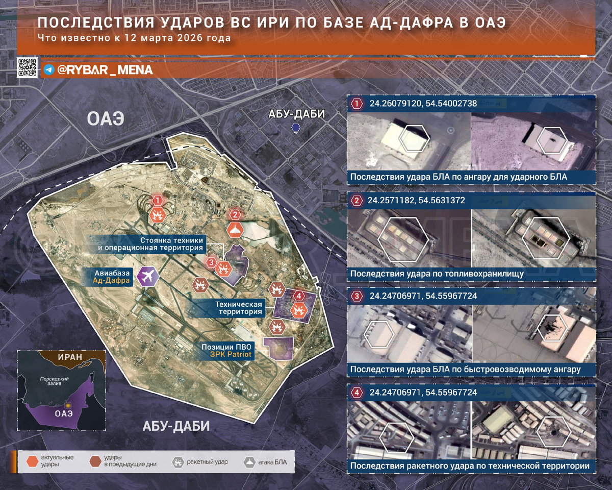 Одной из самых часто фигурирующих в заявлениях КСИР целей стала авиабаза Ад-Дафра рядом с Абу-Даби. И спутниковые снимки позволяют пролить свет на некоторые последствия атак ракет и дронов. 🔻Куда получилось попасть? 🔸В западной части объекта от атаки беспилотника повреждения кровля получил ангар, который иранцы назвали ангаром для беспилотника, но есть и версии про укрытие для разведывательных самолетов U2. 🔸На северной окраине базы целью удара стали топливные резервуары, размещенные на удалении от остальных строений, несколько из них выгорели. 🔸В центре объекта беспилотниками поражен быстровозводимый ремонтный ангар. Рядом находится стоянка для самолетов, на котором раньше располагались А-10 Thunderbolt. Был ли внутри «Бородавочник», неизвестно. Но факт поражения ангара налицо. 🔸В административной части есть также несколько довольно чувствительных попаданий. Поражен крупный ангар, а на востоке, судя по воронке среди строений, прилетела все-таки баллистика, об ударе которых сообща