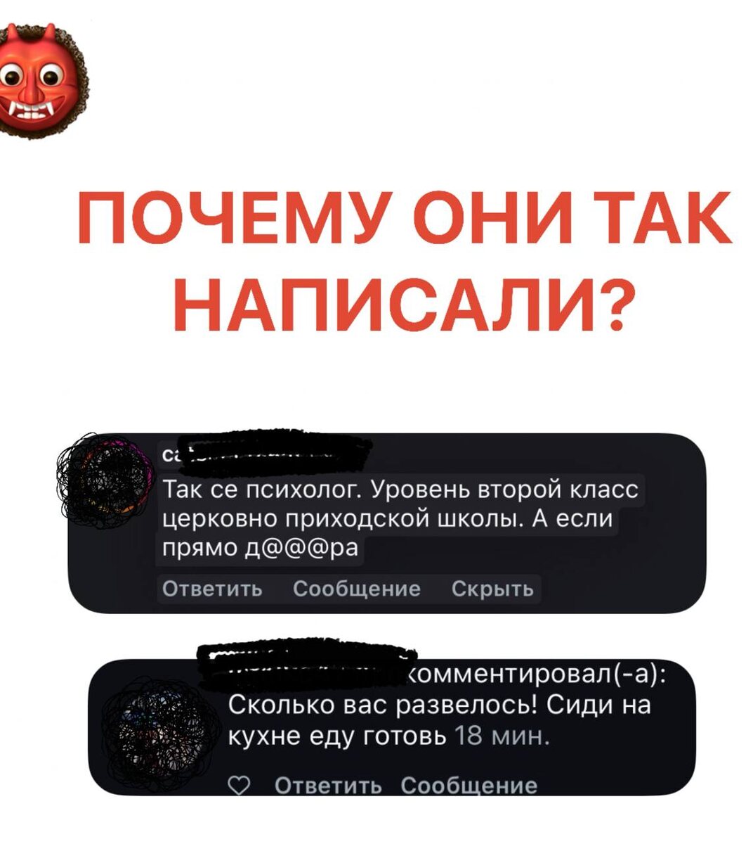Давайте разбираться, почему люди пишут такое. Самое важно, что нужно всегда держать в голове: Хейтеры пишут вам, но не про вас. Они пишут про себя. В этих двух случаях я предполагаю какую-то неудовлетворенность: 💰Финансовую 👩❤️👨Личную 🧑💻Профессиональную и тп И вместо того, чтобы признать, что это ответственность человека, у него срабатывают защитные механизмы: 1️⃣Проекция Ему больно от собственных неудач, но признать это невыносимо. Проще приписать мне свои недостатки и обзывать меня, ругая по сути себя. 2️⃣Смещенная агрессия Начальник накричал, партнер не уважает, в паспорте возраст, а в кармане пусто. Агрессия копится, но выплеснуть её на реального обидчика страшно или невозможно (уволят, разрушат отношения). Нужна безопасная мишень - человек, который не даст сдачи физически. ‼️Помните, пожалуйста, что хейтеры будут ВСЕГДА, чем больше становится ваш блог, тем больше их будет, важно не менять свое поведение, пытаясь всем угодить, а продолжать делать публикации. Если боит