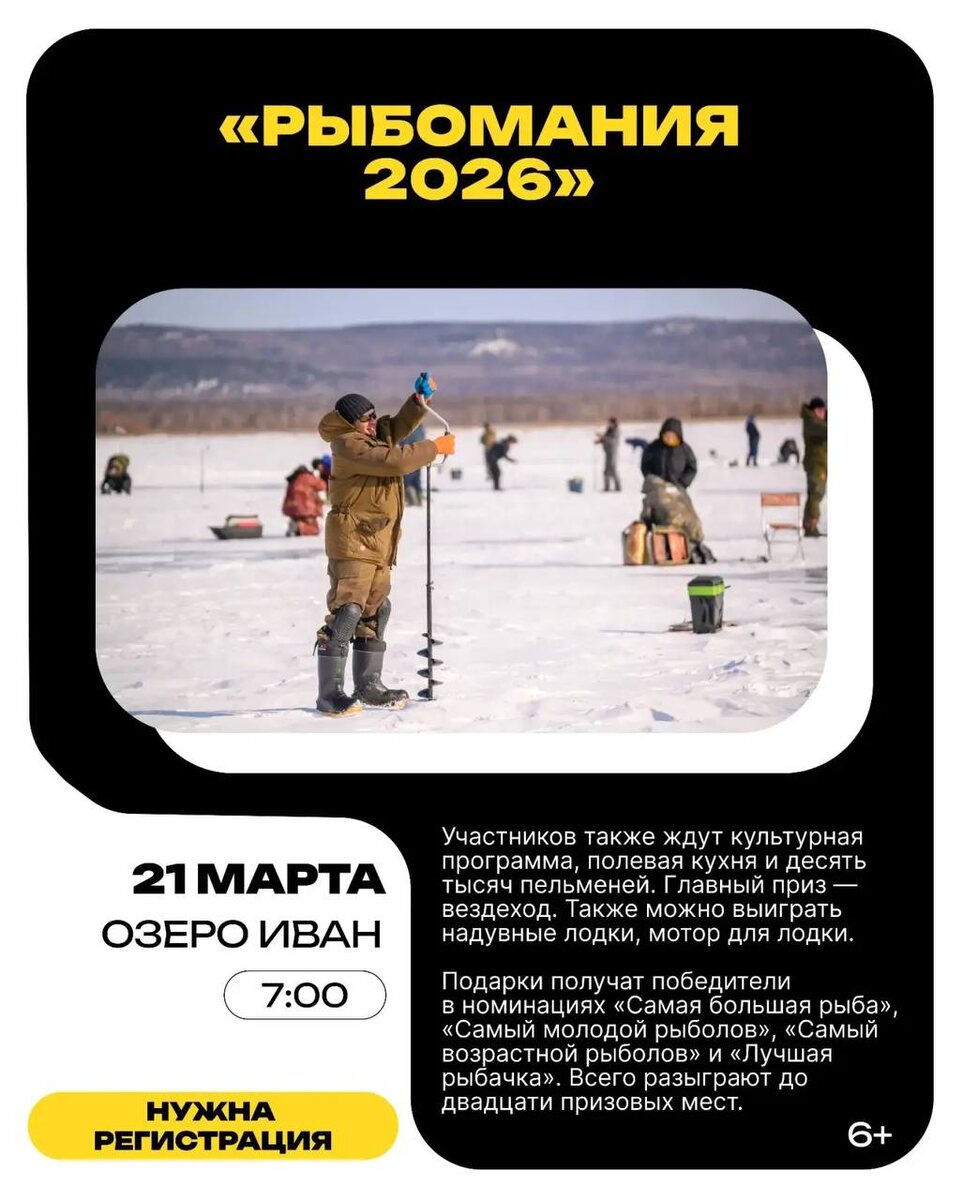 На фестивале любителей рыбалки «Рыбомания-2026» разыграют вездеход. В командном первенстве приглашают участвовать всех желающих. В группе — три человека. Детей до 14 лет допускают в сопровождении взрослых. Участвовать могут и семьи. Зарегистрироваться нужно в магазине «Адреналин» (ул. Нечаева, 81) или на месте проведения фестиваля. Сбор участников пройдет с 07:00 до 08:55. Открытие фестиваля начнётся в 09:00. Подсчёт результатов и подведение итогов стартуют в 13:20, церемония награждения — в 14:50. 🟦 Быть на связи в MAX