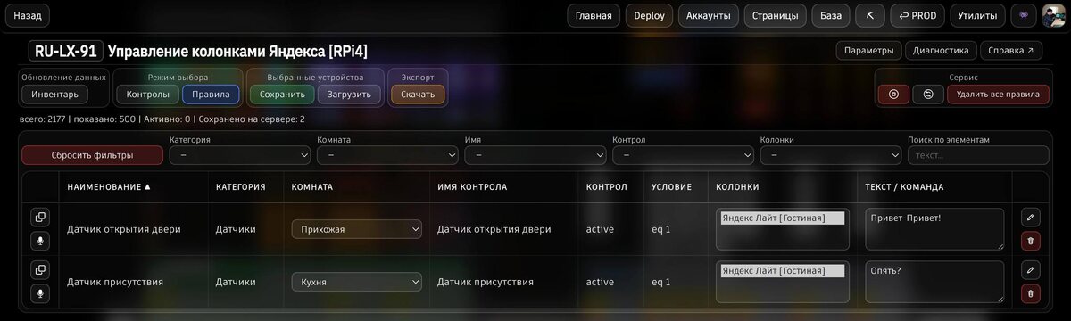 На контроллер Wiren Board или Raspberry Py устанавливается небольшой «шлюз», в который сохраняются параметры подключения к контроллеру и колонкам. А затем на сайте получаем перечень контролов и колонок, выбираем нужное состояние, колонку/колонки, громкость и выбираем действие - текст, команда, включить музыку и т.п. Пока всё работает через сайт, но именно взаимодействие контроллеров и колонок - полностью локальное, так как правила с сервера сохраняются на контроллер. Сохраняемся и вуаля - открылась входная дверь, Алиса уже приветствует, зашли в кухню в зону датчика присутствия и Алиса оповещает. Очень удобно в следующих сценариях: 1. Протечка в какой-либо комнате 2. Если есть распознавание лиц с камер то оповестить что нужный человек пришел 3. Уведомление о заканчивающейся соли в посудомоечной машине при входе в кухню И многое, многое другое