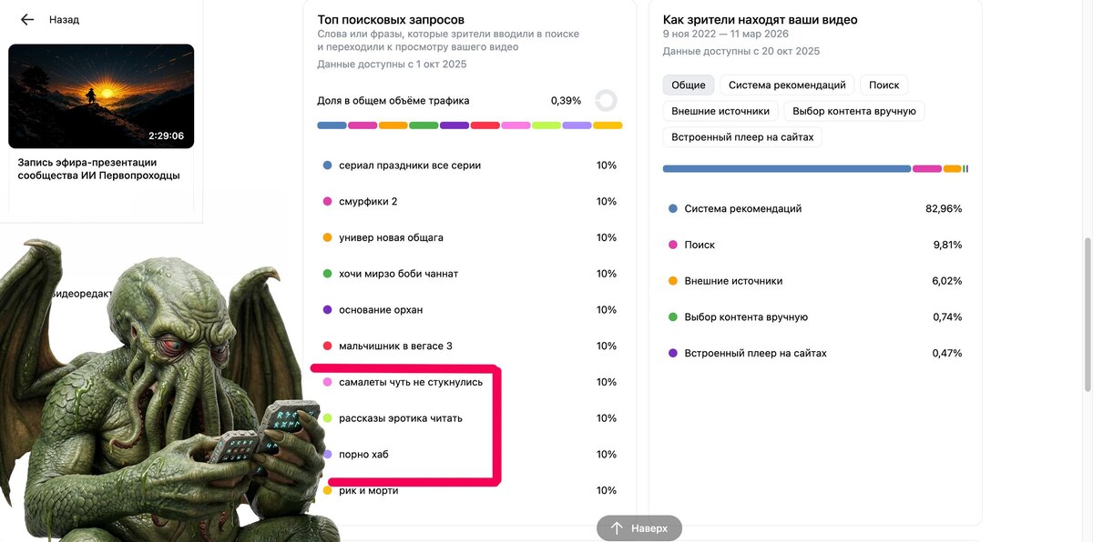 Вот вам дали Ferrari. Двигатель V12. Кожаный салон, инженеры плакали от счастья на презентации... А вы решили приварить к нему кузов от «Газели», воткнуть руль от трактора и покрасить в цвет детской неожиданности. Примерно это произошло с ВКонтакте. Два месяца назад я залил на ВК видео. Конкретное, с чётким названием, про нейросети. Тема узкая, аудитория понятная — люди, которые интересуются ИИ. Казалось бы, алгоритм должен показать это тем, кто смотрит похожий контент. Элементарная задача, с которой YouTube справляется с закрытыми глазами. Что сделал ВК? Начал форсить это видео по запросам, которые не имеют к нему вообще никакого отношения. Люди ищут рецепт борща — получают моё видео про нейросети. Кто-то хочет посмотреть футбол — вот тебе нейросети. Бабушка ищет вязание крючком — на, бабуля, держи искусственный интеллект... ну и "Порно хаб" со скриншота заодно. Вспомнить молодость. Это не временно-нерешенная проблема с алгоритмами рекомендаций, а система, которая не понимае
