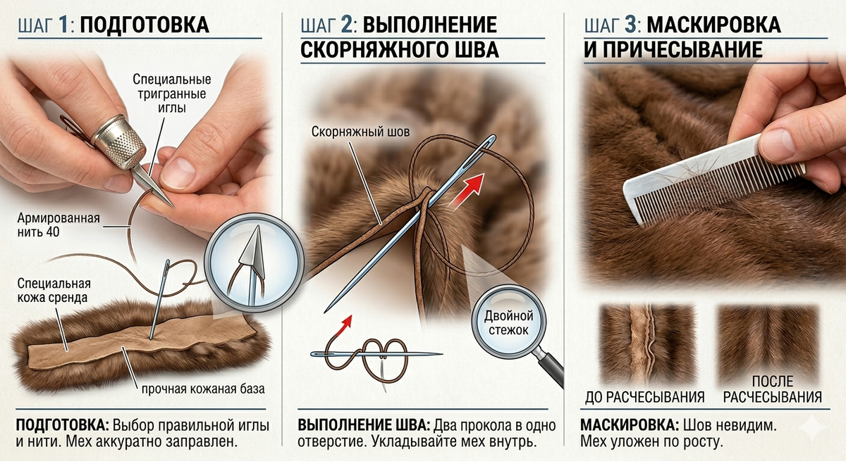 Разрыв на шубе — это не приговор, а повод проявить ювелирную аккуратность. Чаще всего мех рвется под мышками (от натяжения) или по шву на спине. Мы будем использовать скорняжный шов — именно так шьют шубы на фабриках. Он прочный, плоский и совершенно незаметный с лицевой стороны. Представляем вам подробный визуальный мастер-класс.