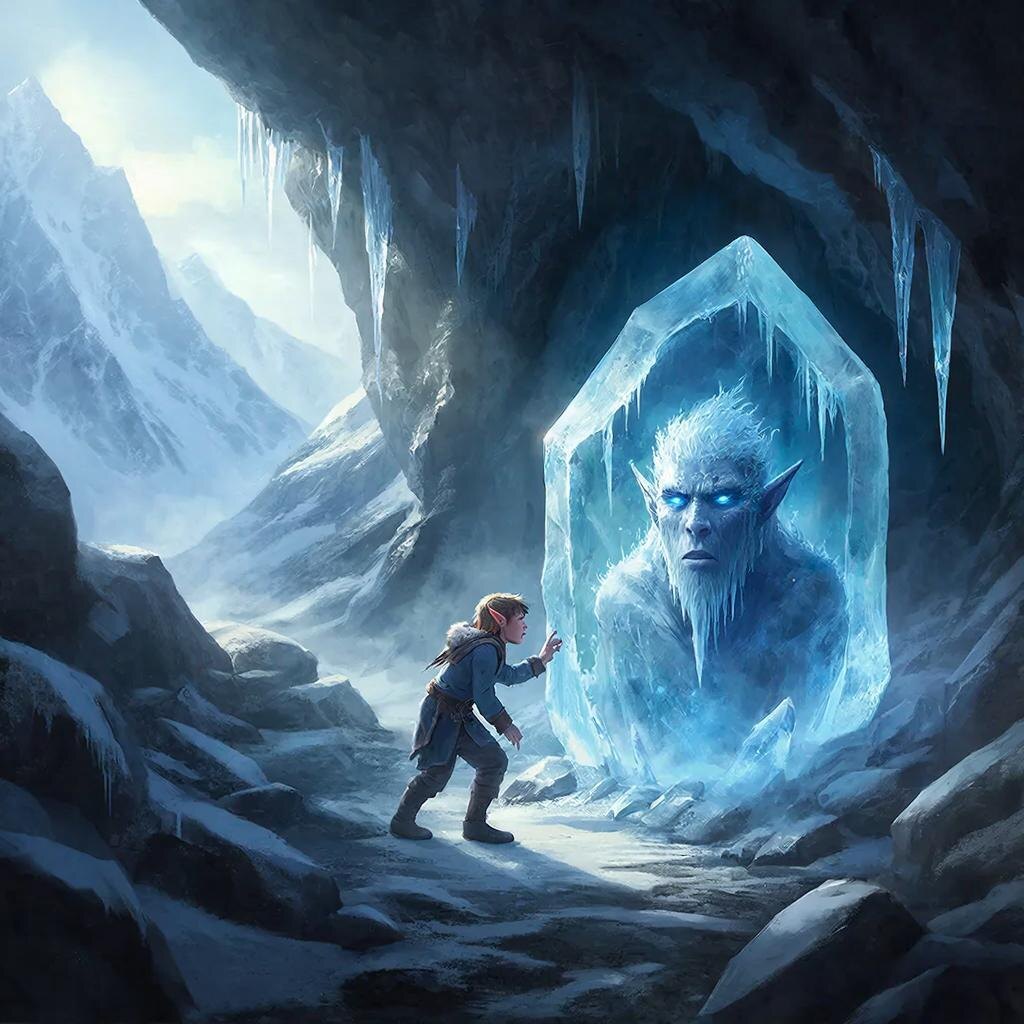 Сквозь метели и морозы он поднялся на вершины гор, где воздух был настолько холодным, что казался живым. Лесные тропы сменялись обледенелыми скалами, а тишина казалась наполненной тайным шёпотом ветра. Через несколько дней поисков он наткнулся на ледяную пещеру, внутренняя стена которой сияла голубоватым светом.