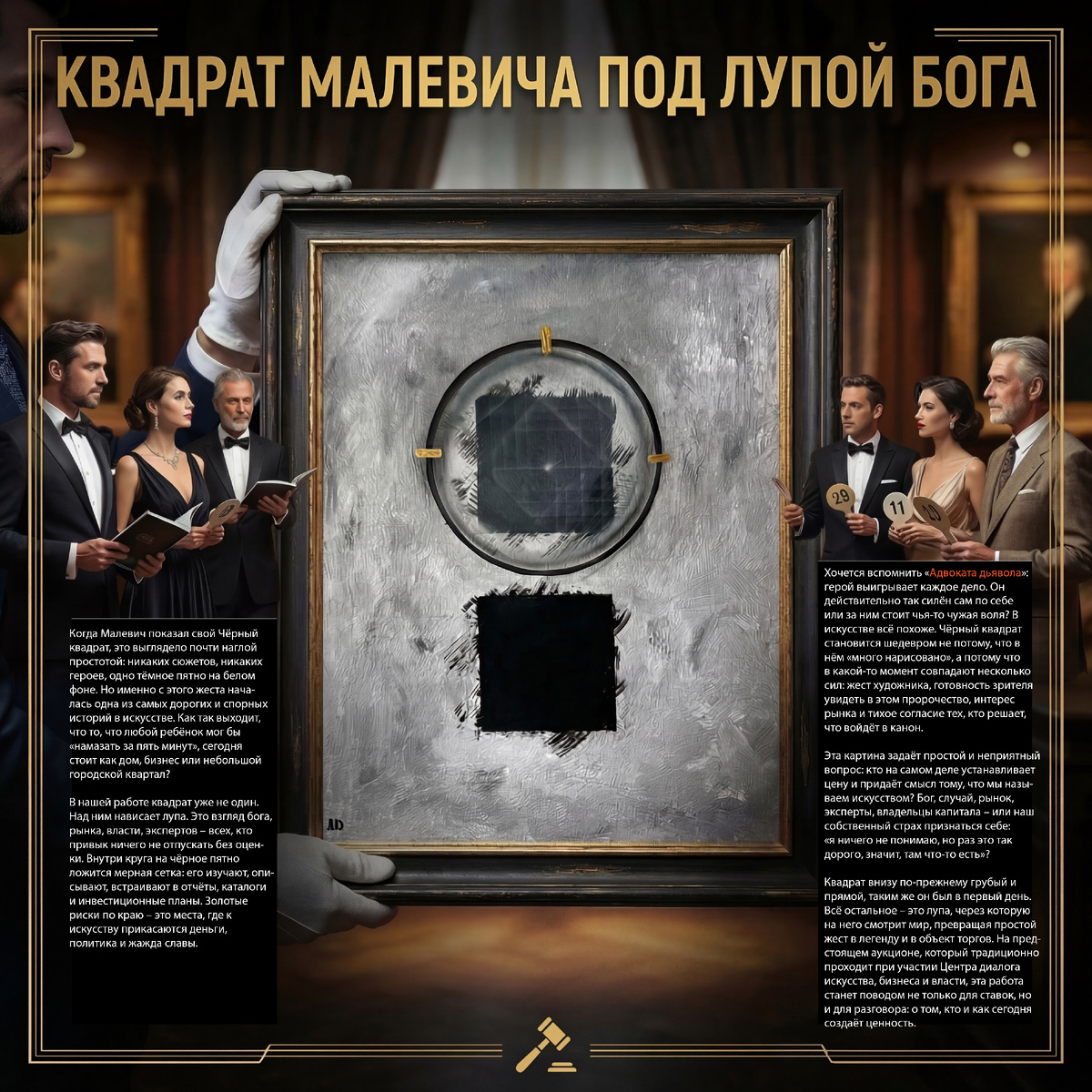 Холст на подрамнике 40х50 масло + акрил. Чёрный квадрат Малевича когда‑то был просто тёмным пятном на белом фоне – сегодня он стоит, серьёзную сумму денег. В нашей новой работе над квадратом нависает лупа: бог, рынок, власть и эксперты измеряют, описывают и оценивают то, что ещё вчера было «намазано за пять минут». Картина задаёт неприятный вопрос: кто на самом деле устанавливает цену и придаёт смысл – художник, зритель, рынок или наш страх признаться, что «ничего не понятно, но очень дорого»? Этот сюжет станет лотом на аукционе при участии Центра диалога искусства, бизнеса и власти и точкой притяжения для тех, кто готов торговаться не только деньгами, но и смыслами. Арт‑вечер с аукционом и презентацией интерпретаций мировых шедевров мы планируем провести в Раклет-баре «Малевич» в Коломне . Совсем скоро расскажем детали и откроем регистрацию. Автор Дмитрий Хуртов. Все актуальные новости в нашем сообществе ВК.