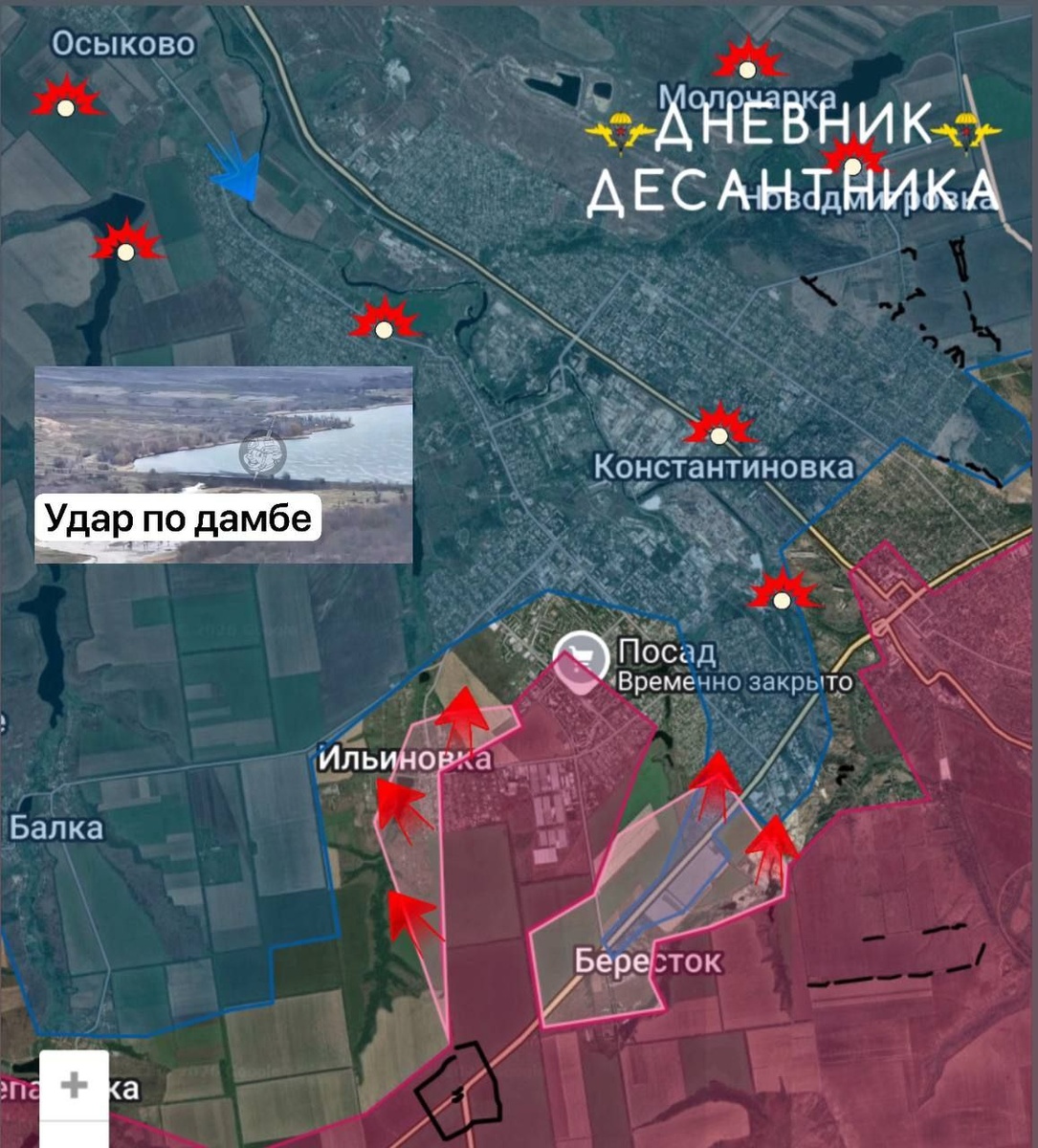 ▫️ В Берестке наши бойцы зачистили основную часть села и продвигаются в западную часть города, бои идут ближе к проспекту. ▫️ В Ильиновке наши бойцы взяли под контроль территорию до балки и прудов. Западная часть села зачищается, ВСУ по стандарту малые группы кидают на убой и пытаются остановить наше продвижение дронами. ▫️ Также наши войска наносят регулярно удары по дамбам северо-западнее Константиновки, тем самым не только нарушая логистику ВСУ, но и лишая их укрытий из-за подтоплений в результате подрыва дамб. ▫️ ВСУ отходят в капитальную застройку в Константиновке, тем самым становятся для нас ещё более легкой мишенью. ▫️ В самом городе активных наступлений с нашей стороны нет, работаем дистанционно по позициям противника, так как у врага достаточно огневых и наблюдательных точек на верхних этажах многоквартирных домов. ▫️ Между тем наши войска улучшают логистику и укрепляют оборонительные линии на южных подступах к Константиновке, обеспечивая уверенный контроль на данном уча