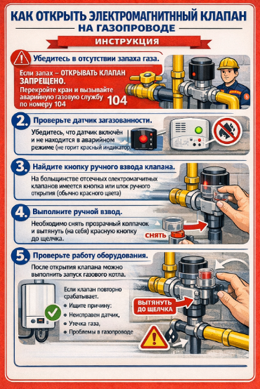 В ряде случаев, если перекрыт именно электромагнитный клапан на газопроводе (предохранительный отсечной клапан), собственник может самостоятельно восстановить подачу газа, при условии отсутствия запаха газа и признаков утечки. Важно понимать, что клапан срабатывает по сигналу датчика загазованности или при аварийной ситуации. Если причина срабатывания не устранена, повторное открытие приведёт к повторной блокировке.