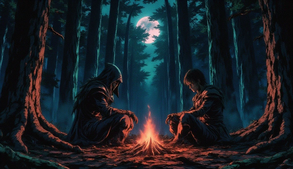 Ночь выползла из леса бесшумно, как зверь, который давно следит за тобой и только сейчас решил показаться. Лин сидел у костра напротив фигуры в балахоне. Пламя лизало сухие ветки, выхватывая из темноты корявые стволы, корни, похожие на сплетённые пальцы, и край серой ткани, которая не собирала лесной сор. Странно, но Лин не чувствовал холода. Впервые за всё время здесь.
