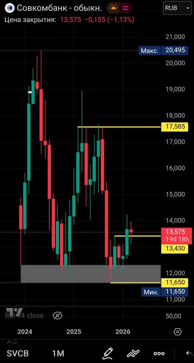 В Совкомбанке интересный момент. 2 февраля в своем видео я говорил про боковик 11,6–13,4, в нем стояли полгода, при пробое цена улетала на 14,2. И сейчас мы ретестим сверху этот боковик, цена 13,5. Каждый сам решает, что делать. Для меня ближайшая цель в районе 15₽. Глядя на результаты Сбера, на нефть, которая сегодня будет выше 100$ за баррель, и слова президента про нефтегазовые компании, что им нужно воспользоваться конъюнктурой для покрытия долгов перед банками... Выглядит банковский сектор фаворитом. Поэтому среднесрочно здесь можно поиграться. Рынок всегда дает отличные возможности тем, кто умеет сопоставлять факты и видеть тренды до того, как они станут очевидны всем. Банки сейчас смотрятся уверенно, и мы готовы забирать свои движения. Держим руку на пульсе и работаем по стратегии! Оставайтесь на канале, чтобы не пропустить следующие разборы и найти лучшие точки входа. Пост так же продублирован в мессенджере MAX. Добавляйся, чтобы не потерять связь 👇 https://max.ru/join/Gz5