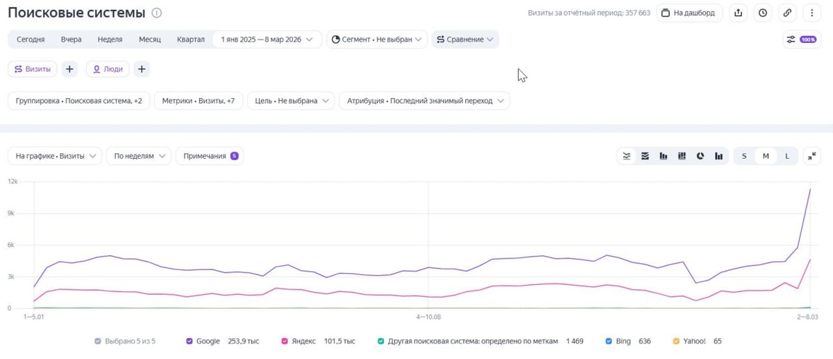 Тематика - корпоративы, организация шоу, ведущие на различные мероприятия и подобное. За 8 месяцев была сделана полная внутренняя оптимизация, переработаны посадочные страницы (ещё много работы есть по уникализации шаблонов под каждый кластер услуг - именно юзабилити, дизайн, переработка блоков), сгенерены сотни текстов с учётом ключей и LSI, проработана текстовая релевантность, переделаны само собой метатеги 😁 Созданы десятки новых посадочных страниц под разные праздники и возрастные категории. Из внешки всё как всегда стандартно - простановка статейных ссылок, крауд-маркетинг, каталоги, для жирных запросов второй уровень ссылок. До PBN-сеток пока не дошли. Из интересного и довольно нового - GEO-продвижение, которое мы начали оказывать клиентам на SEO в рамках комплексного продвижения, а также и как отдельную услугу (кому интересно пишите в личку @vysokoff). Это, кстати, был один из первых проектов на котором тестили продвижение в нейросетях - первые эксперименты были проделаны е