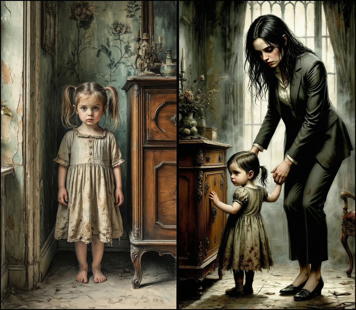 Вечером, когда в большом зале сами зажглись лампочки в люстре и бра на стенах, я услышала плач. Не громкий, а тот, что слышится эхом на грани сознания, раздумывала не показалось ли мне и всё-таки решила пойти проверить откуда исходит этот звук. За старым сервантом сидела девочка лет шести. Тонкие косички растрепались, платьице в пыли и пятнах от ягод. Смотрит на меня из темноты с тревогой, даже страхом.