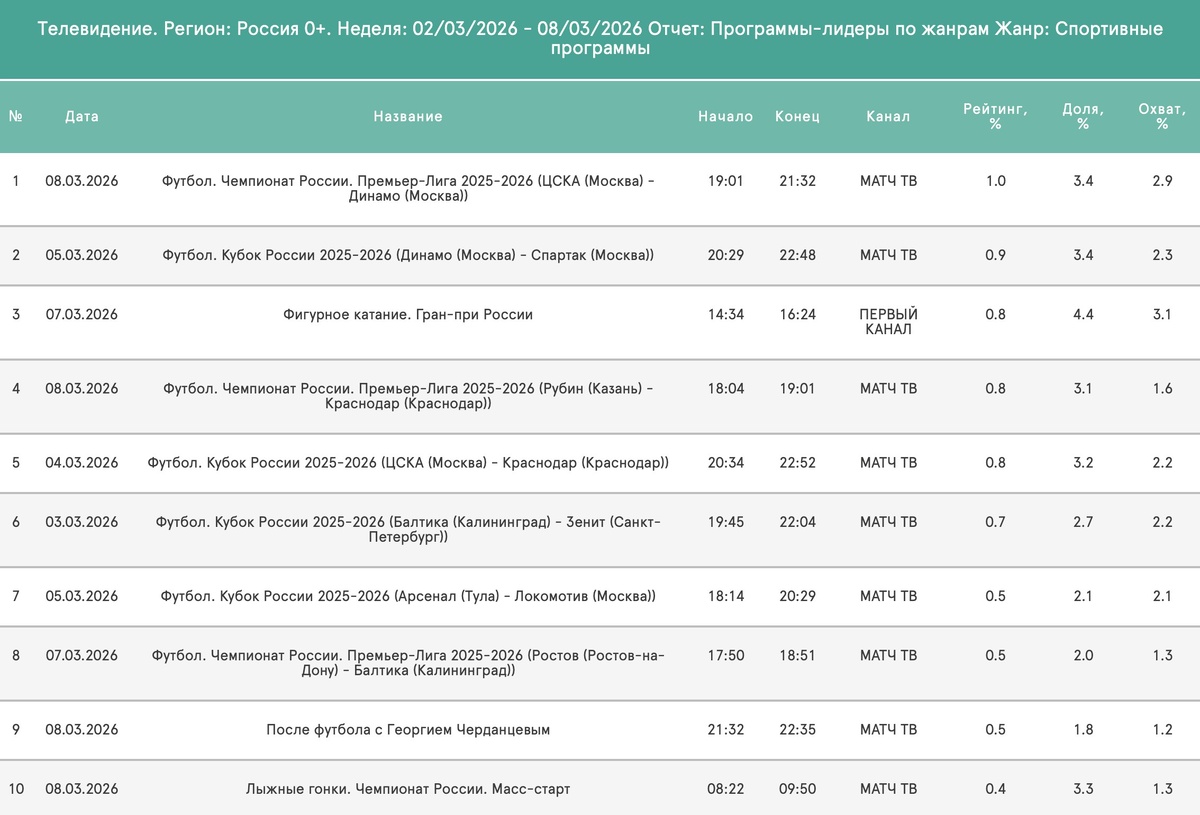 »? Россия, 4+ (137,4 млн чел.) 🗣Есть первая весенняя "единичка". Её забирает московское дерби "конной милиции"; 🗣На втором месте провал "Спартака" в Петровском парке. Самая накручиваемая команда Европы - лишь на 6 месте у телезрителей; 🗣3 игры РПЛ в открытом доступе в эти выходные: "Спартак" в Питере, ЦСКА в Калининграде и "Локомотив" в Казани. Топ 25/26: 1.4 - 🟢:🟠| РПЛ 1.4 - ⛸ | ЧР (🌟) 1.3 - 🔴:❤️| РПЛ 1.2 - 🟢:🔵| РПЛ 1.2 - 🔵:🔴| РПЛ 1.2 - ⛸ | ЧР (🌟) - 1.1 - 🔴:🔵| РПЛ 1.1 - 🇶🇦:🇷🇺 | ТМ 1.1 - ❤️:🔴| РПЛ 1.1 - 🟢:🟠| РПЛ 1.1 - ❤️:🔵| РПЛ 1.1 - 🟢:🟢| РПЛ 1.1 - 🔴:🔵| РПЛ - 1.0 - ❤️:❤️| РПЛ 1.0 - ❤️:🔵| РПЛ 1.0 - ❤️:❤️| РПЛ 1.0 - 🇷🇺:🇮🇷 | ТМ 1.0 - 🇷🇺:🇧🇴 | ТМ 1.0 - 🔵:🔵| РПЛ 1.0 - 🟢:🔴| РПЛ 1.0 - 🔵:🟢| РПЛ 1.0 - 🇷🇺:🇨🇱 | ТМ 1.0 - 🇷🇺:🇵🇪 | ТМ 1.0 - ⛸ | Гран-при России (🌟) 1.0 - ❤️:🔴| КР 1.0 - 🔵:🔵| КР 1.0 - ⛸ | ЧР (🌟) 1.0 - ❤️:🔵| РПЛ #рейтинги @priotdal