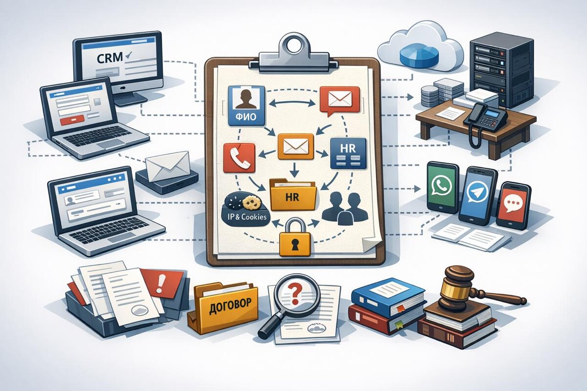 ? Одна из первых вещей, которую проверяют при аудите по 152-ФЗ — понимает ли компания, какие персональные данные она вообще собирает и где они находятся. Удивительно, но во многих компаниях ответ выглядит так: «Где-то в CRM, где-то у маркетолога, что-то на сайте…» Это и есть главная проблема. Если бизнес не понимает путь персональных данных, он не может обеспечить их законную обработку. Что такое карта персональных данных? Карта данных — это схема, которая показывает: • какие персональные данные собираются • откуда они поступают • где хранятся • кто имеет доступ • кому передаются По сути, это карта движения данных внутри компании. Какие данные чаще всего собирает бизнес? Большинство компаний обрабатывают: 📌 ФИО 📌 номер телефона 📌 email 📌 данные сотрудников 📌 IP-адреса и cookies 📌 переписки в мессенджерах 📌 заявки и обращения клиентов Даже телефон + имя в форме на сайте уже считается персональными данными. Где обычно “живут” персональные данные? Когда начинают разби