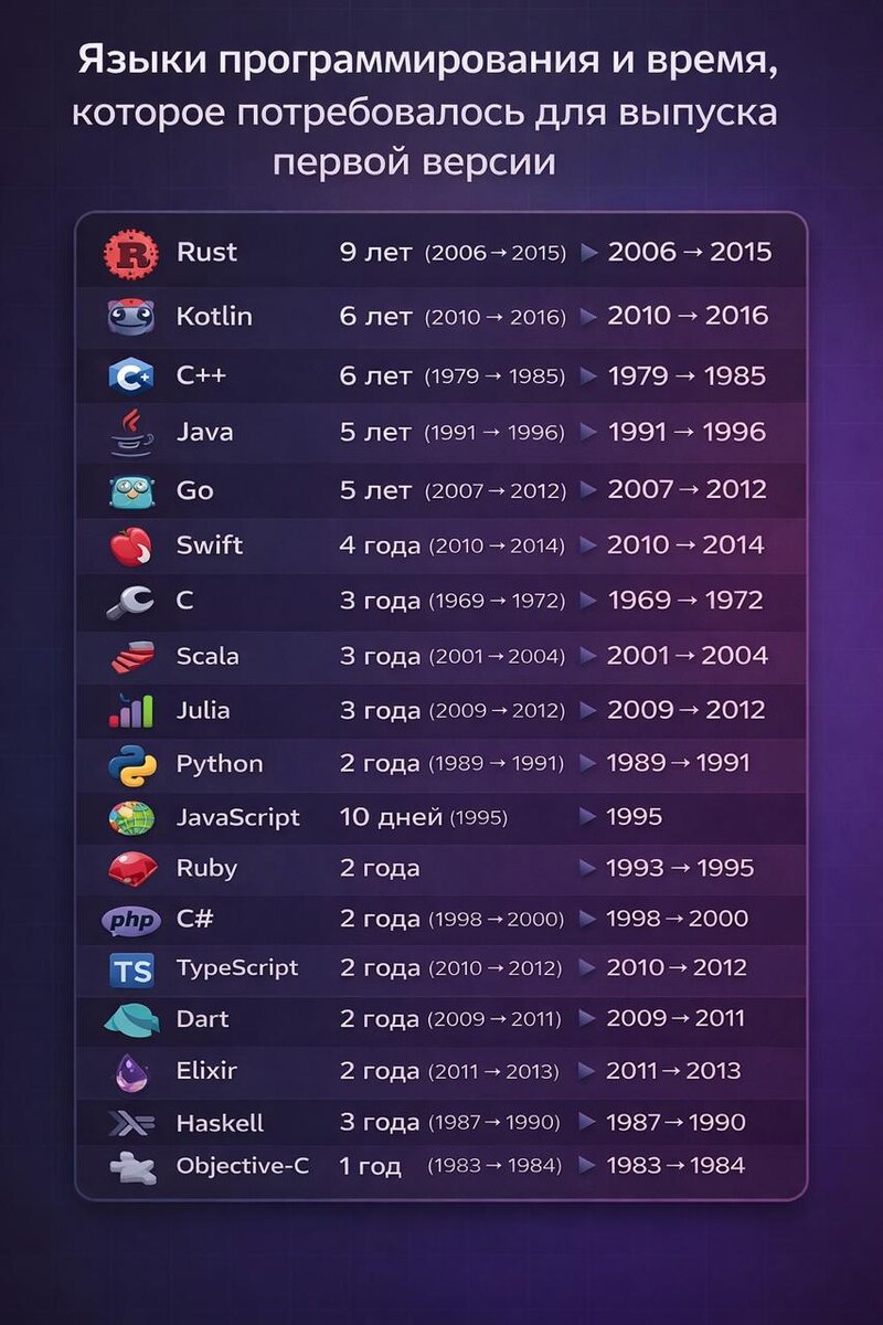 🦀 Rust - 9 лет (2006 → 2015) 🤖 Kotlin - 6 лет (2010 → 2016) ⚙️ C++ - 6 лет (1979 → 1985) ☕ Java - 5 лет (1991 → 1996) 🐹 Go - 5 лет (2007 → 2012) 🍎 Swift - 4 года (2010 → 2014) 🔧 C - 3 года (1969 → 1972) 🧬 Scala - 3 года (2001 → 2004) 📊 Julia - 3 года (2009 → 2012) 🐍 Python - 2 года (1989 → 1991) 🌐 JavaScript - 10 дней (1995) 💎 Ruby - 2 года (1993 → 1995) 🐘 PHP - 1 год (1994 → 1995) 🔷 C# - 2 года (1998 → 2000) 🎯 TypeScript - 2 года (2010 → 2012) 🎯 Dart - 2 года (2009 → 2011) ⚡ Elixir - 2 года (2011 → 2013) 🧠 Haskell - 3 года (1987 → 1990) 🧩 Objective-C - 1 год (1983 → 1984)