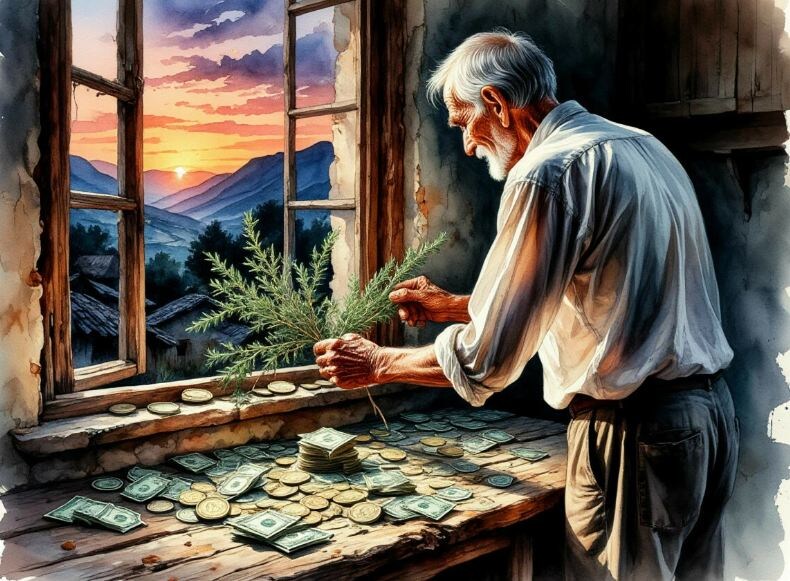 Старик стоял спиной к стеклу, перед столом. На столе — россыпь денег. Мятые бумажки, мелочь, всё в кучу. Румын не считал. Он медленно водил над деньгами сухой веткой полыни. Раз. Два. Три. Крест-накрест.