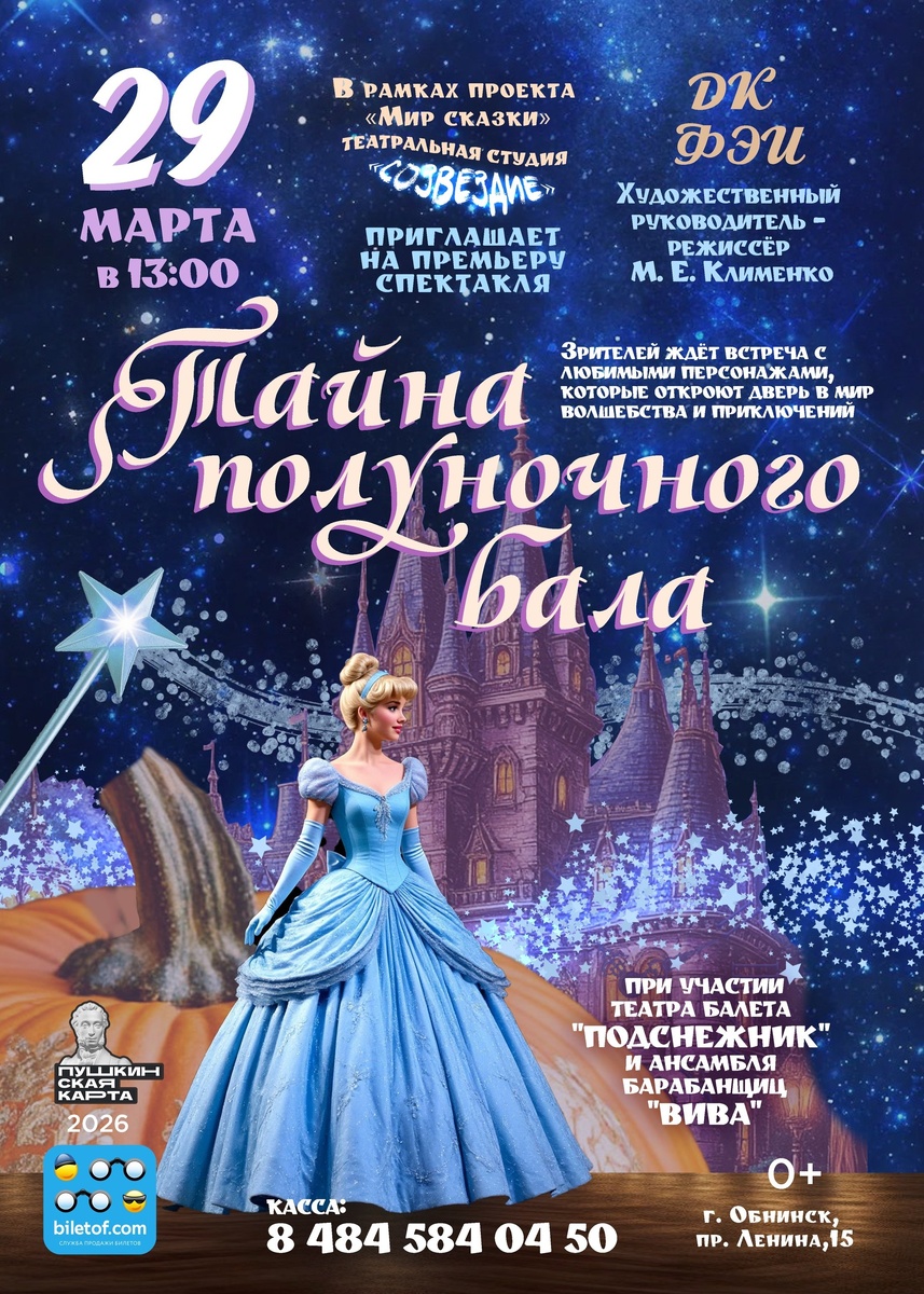 полуночного зала» по мотивам сказки «Золушка». Зрителей ждёт поучительная история о доброй и красивой Золушке, которая вынуждена прислуживать своей злой мачехе и сводным сёстрам. Несмотря на трудности, героиня сохраняет доброту и веру в лучшее — и в конце концов обретает счастье. Участники постановки: — Театральная студия «Созвездие». Художественный руководитель и режиссёр спектакля — Марина Евгеньевна Клименко. — Народный коллектив театр балета «Подснежник». Руководитель — заслуженный работник культуры Калужской области Елена Львовна Дерябина. — Народный коллектив ансамбль барабанщиц «Вива». Руководитель — Марина Вячеславовна Колеватых. 🎫Билеты в кассе (Вт-Сб с 13:00 до 19:00) или онлайн: https://biletof.com/action/?ra=18735&frame=1. Совсем скоро появится возможность оплаты Пушкинской картой. Обнинск, пр-т Ленина, 15. 👍 Подписаться | Ваша реклама