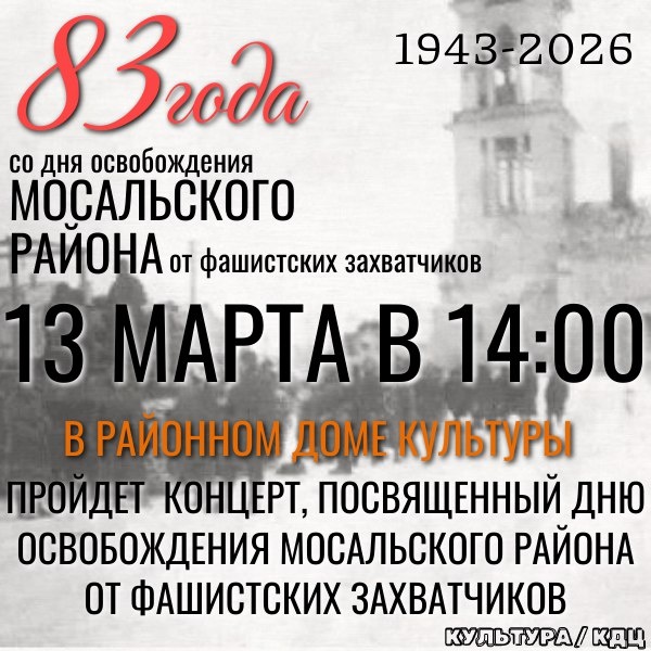 🔥Друзья, приглашаем вас на концерт, посвященный дню освобождения Мосальского района от фашистских захватчиков