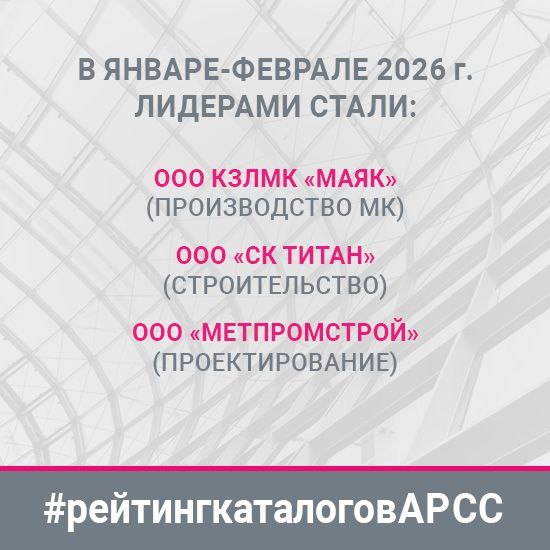проектированию, изготовлению металлоконструкций и монтажу. 📍АРСС публикует рейтинг наиболее просматриваемых компаний в каталогах производителей металлоконструкций, строительно-монтажных организаций и реестре проектировщиков. ✅По итогам января-февраля 2026 года в ТОП-5 каждого каталога вошли следующие компании: 📌Каталог производителей металлоконструкций 1⃣ место — ООО «Канский завод легких металлоконструкций «МАЯК» 2⃣ место — ООО «Профлист-С ("Стальнофф")» 3⃣ место — АО «Кулебакский ЗМК» (КЗМК) 4⃣ место — ООО «Орский завод металлоконструкций» 5⃣ место — ООО «Тихвинский завод строительных металлических конструкций (ТЗСМК)» 📌Каталог строительно-монтажных организаций 1⃣ место — ООО «Строительная компания Титан» 2⃣ место — ООО «Проминбург» 3⃣ место — ООО «"МЕТПРОМСТРОЙ"» 4⃣ место — АО «ПРОКАТМОНТАЖ» 5⃣ место — ООО «Современные Строительные Решения (ССР)» 📌Реестр проектных организаций 1⃣ место — ООО «МетПромСтрой» 2⃣ место — ОДО «Проектное бюро г. Борисов» 3⃣ место — ООО «Стилл