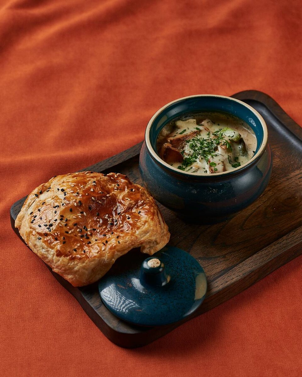 Это блюдо — настоящая симфония вкуса, скрытая под хрустящей «шапочкой» из нежного слоеного теста. Внутри — сочное филе волжского судака в дуэте с дарами моря: нежным кальмаром и мясом мидий. Мы томим их в бархатистом сливочном соусе с добавлением моцареллы и пармезана, который обволакивает каждую деталь… Разломите горячую, посыпанную кунжутом корочку, чтобы выпустить облако пряного пара и насладиться идеальным сочетанием речной рыбы и нежных сливок.