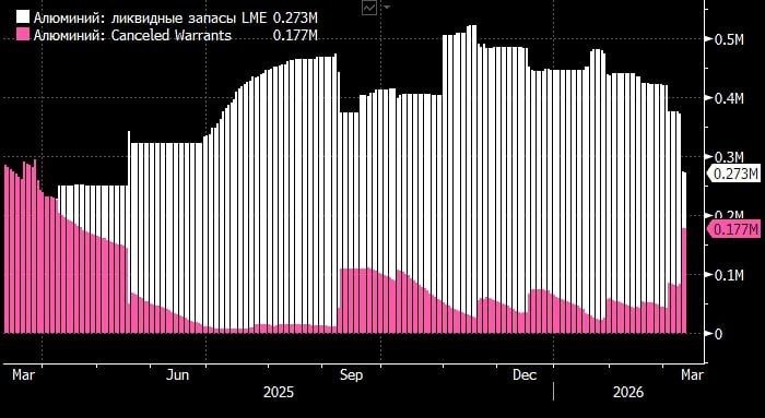 ) ⚡️Запасы алюминия на бирже в Лондоне быстро истощаются из-за проблем с поставками с Ближнего Востока Сейчас российский алюминий занимает более 90% ликвидной части запасов Лондонской биржи металлов. Швейцарская компания Mercuria накануне зарезервировала для поставки почти 100тыс тонн алюминия на склады, одобренные Лондонской биржей металлов (LME), в порту Кланга, Малайзия. LME ежедневно сообщает об уровне запасов по варрантам (On Warrants) и так называемым аннулированным варрантам (Canceled Warrants), но не называет имена участвующих трейдеров. Warrants + Canceled Warrants = Общие запасы металла на LME. Но Canceled Warrants — это тот тоннаж, который уже ожидает указаний владельца складской компании об изъятии со склада или повторной выдаче варранта. Соответственно, чтобы понять, какова ликвидная часть запасов, нужно из общей суммы запасы вычесть Canceled Warrants. Так, 27 февраля, перед началом войны в Иране, Canceled Warrants составляли 9% от общего уровня запасов LME. Сейчас же эт