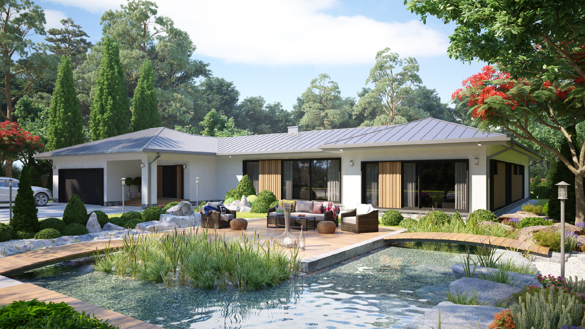 «Эгоист-324» представляет собой современное архитектурное решение для просторного загородного проживания. Особенностью проекта является четкое зонирование: дом разделен на две части, объединенные крытой террасой, что создает уникальную связь между внутренним и внешним пространством. Планировочные решения: Общественная зона: просторная кухня-гостиная, совмещенная с выходом на террасу, образует центральное пространство для общения и приема гостей. Приватная зона: включает три изолированные спальни. Главная спальня (мастер-блок) оснащена индивидуальным санузлом. Инфраструктура:для комфортного проживания предусмотрены три санузла, сауна, отдельный кабинет, гардеробная и кладовая. Техническая зона: отапливаемый гараж с непосредственным входом в дом обеспечивает комфортное перемещение вне зависимости от погодных условий. Характеристики проекта: Общая площадь: 405.92 м² Площадь помещений: 324.13 м² Площадь террас и балконов: 81.79 м² Общая площадь 1 этажа: 405 м² Спальни, шт.: 3 Санузлы, шт.: