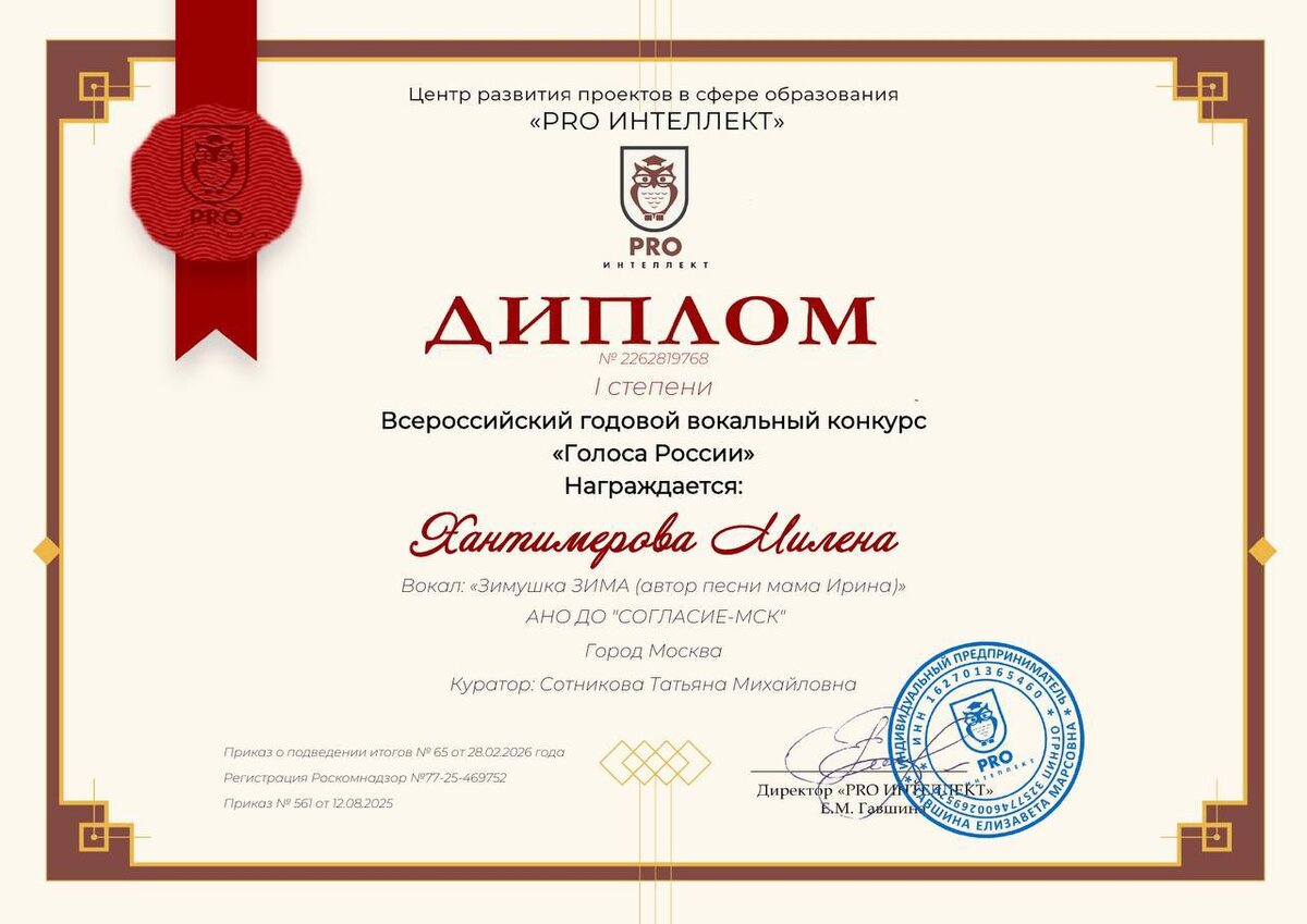 🏆Поздравляем воспитанницу детского сада «Согласие» Хантимерову Милену с победой на Всероссийском годовом вокальном конкурсе «Голоса России». Мы гордимся нашей звездочкой и желаем ей дальнейших побед! 🙌🎉