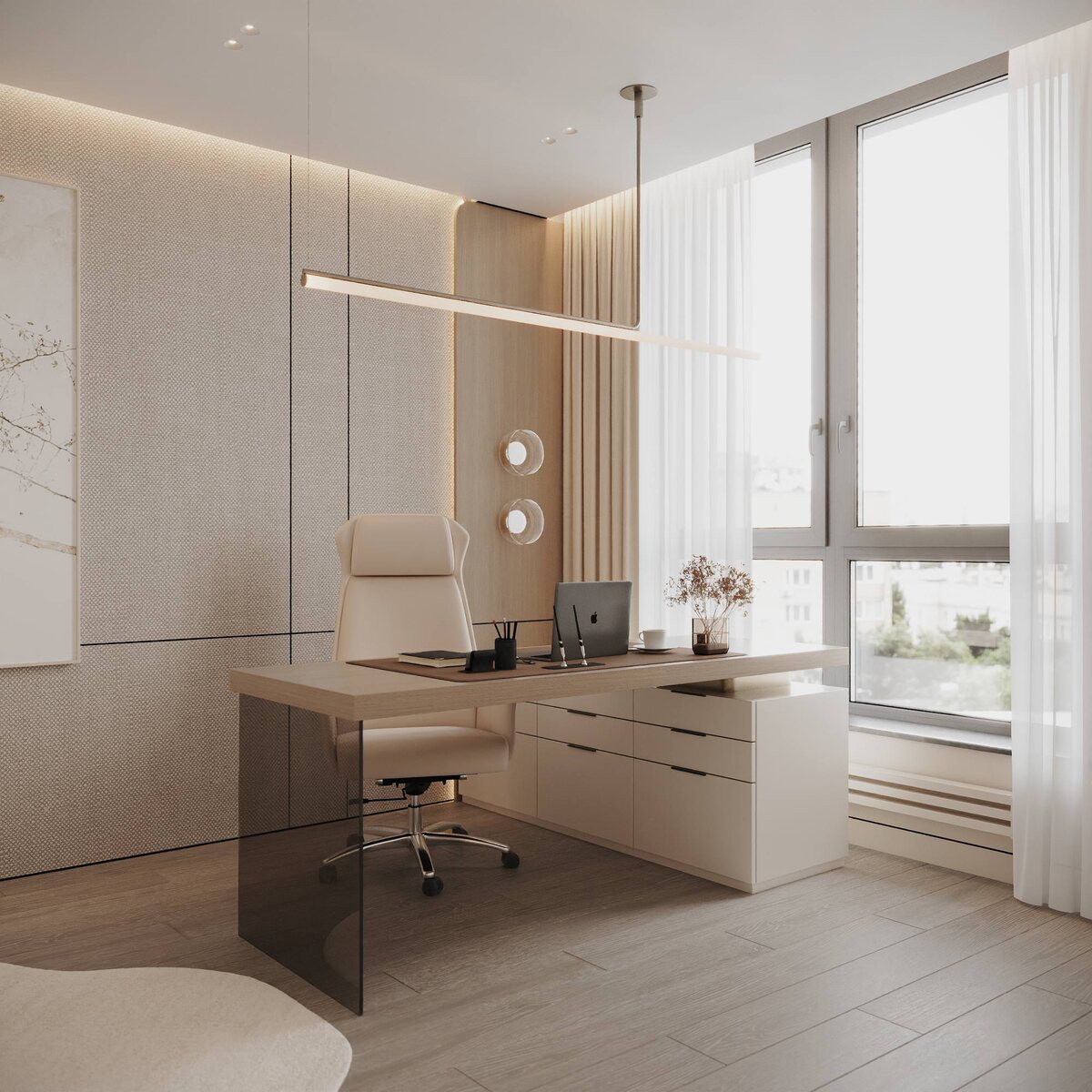 🤍 Минималистичный интерьер в тёплых светлых оттенках: дерево, мягкий текстиль и встроенная подсветка создают спокойную и уютную атмосферу. Лаконичный стол, удобное кресло и большие окна с естественным светом - всё, что нужно для продуктивной работы. Пространство, где дизайн работает на комфорт🔥