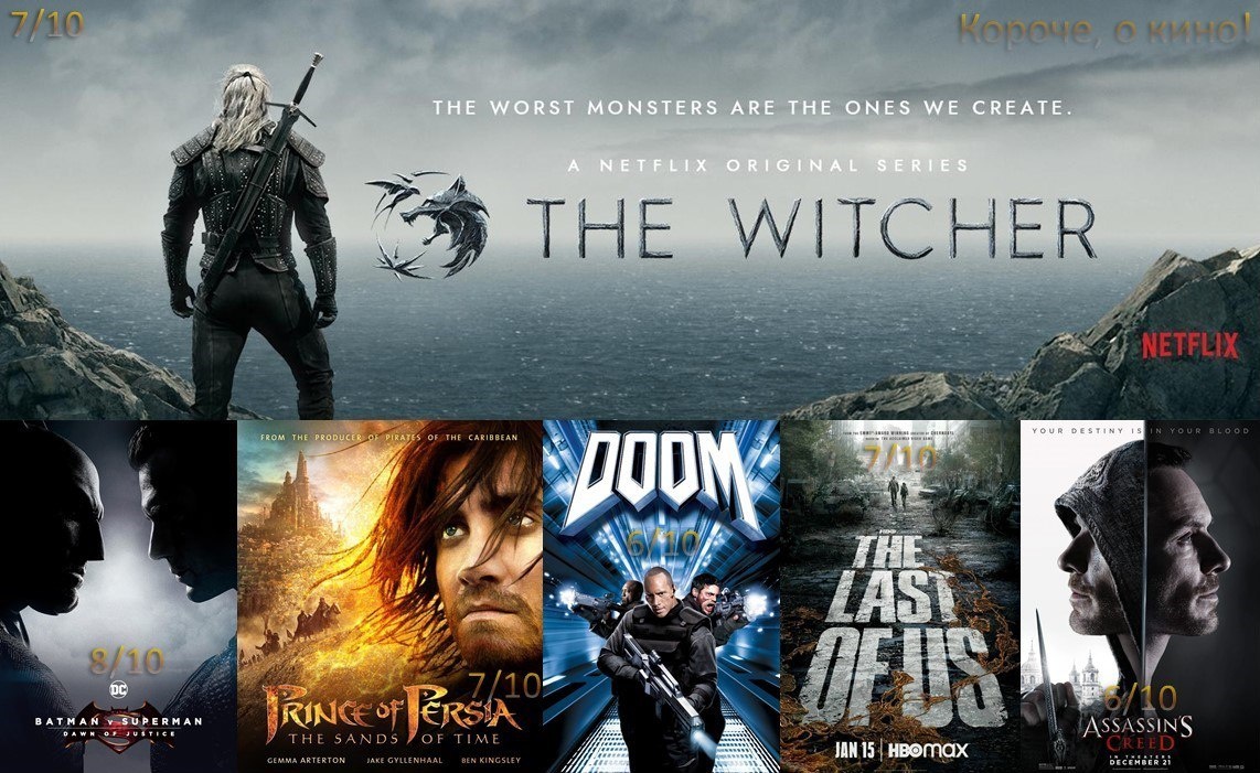 1. Бэтмен против Супермена: На заре справедливости/Batman v Superman: Dawn of Justice 2016 Моя оценка: 8 из 10 Оценка на КП/IMDb: 6,8/6,5 После разрушительных событий в Метрополисе Брюс Уэйн начинает видеть в Супермене угрозу человечеству. 2. Ведьмак/The Witcher 2019-... Моя оценка: 7 из 10 Оценка на КП/IMDb: 7,1/7,9 История Геральта из Ривии — мутанта и охотника на чудовищ, который пытается выжить в мире, где люди часто опаснее монстров. 3. Одни из нас/The Last of Us 2023-... Моя оценка: 7 из 10 Оценка на КП/IMDb: 7,7/8,5 Постапокалиптическая драма о контрабандисте и девочке-подростке, которым предстоит пересечь разрушенную Америку ради спасения человечества. 4. Принц Персии: Пески времени/Prince of Persia: The Sands of Time 2010 Моя оценка: 7 из 10 Оценка на КП/IMDb: 7,3/6,5 Потерявший королевство и престол принц Дастан втягивается в борьбу за магический кинжал, способный управлять временем. 5. Doom 2005 Моя оценка: 6 из 10 Оценка на КП/IMDb: 5,9/5,2 Отряд спецназа отправляется н