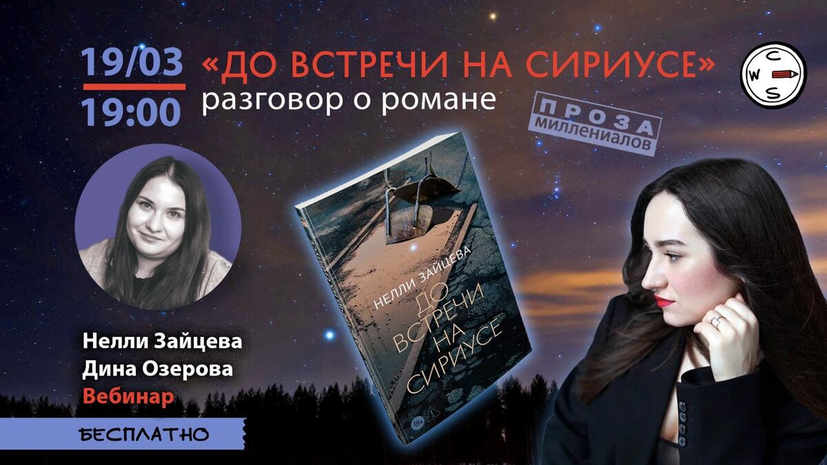несем ответственность перед десятками людей, чьих жизней мы касаемся. На новой встрече цикла «Проза миллениалов» литературная обозревательница Дина Озерова побеседует с писательницей и выпускницей CWS Нелли Зайцевой, чей роман «До встречи на Сириусе» вышел в издательстве «Азбука». Оля и Ден — добровольные изгои. Они дружат со школы, любят цифры, верят в приметы и имеют целый список странных увлечений и правил. Например, встречаться каждое седьмое число в секретном баре. Но однажды Ден не приходит, а наутро оказывается, что он поджег себя и свою квартиру. Оля не верит в версию с самосожжением и едет в родной город на похороны друга, чтобы разобраться в случившемся. Она взламывает его страницу в социальной сети и видит сообщение от незнакомки: «До встречи на Сириусе». Так начинается история, которая ведет в логово опасной тайны. 19 марта в 19:00 мы поговорим с Нелли о том, как строится работа над большой прозой на литературных курсах и после них. А также обсудим, как взгляд со сторон