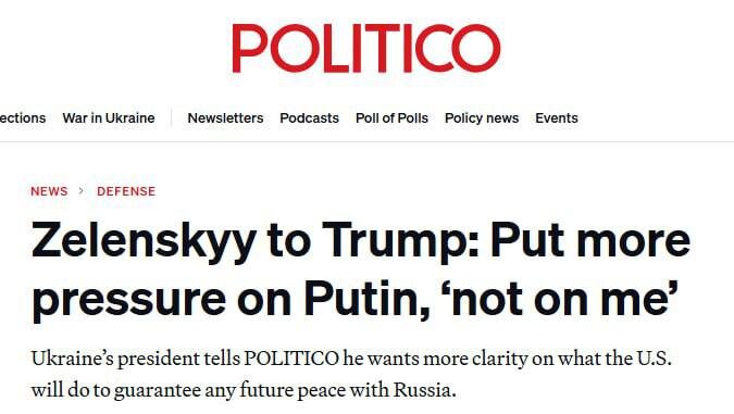 «Нам нужны переговоры. Мы их поддерживаем. Мы не доверяем России, но я думаю и верю, что американцы действительно хотят закончить эту войну. Я надеюсь, что они нам помогут, но нам нужно больше давления на Россию, а не на меня», – заявил он в интервью Politico. Издание отмечает, что комментарий Зеленского «прозвучал спустя неделю после того, как Трамп вновь выразил недовольство Зеленским, заявив, что украинскому лидеру нужно «взять себя в руки» и заключить сделку». 🤗 НАСОНОВ ▶️