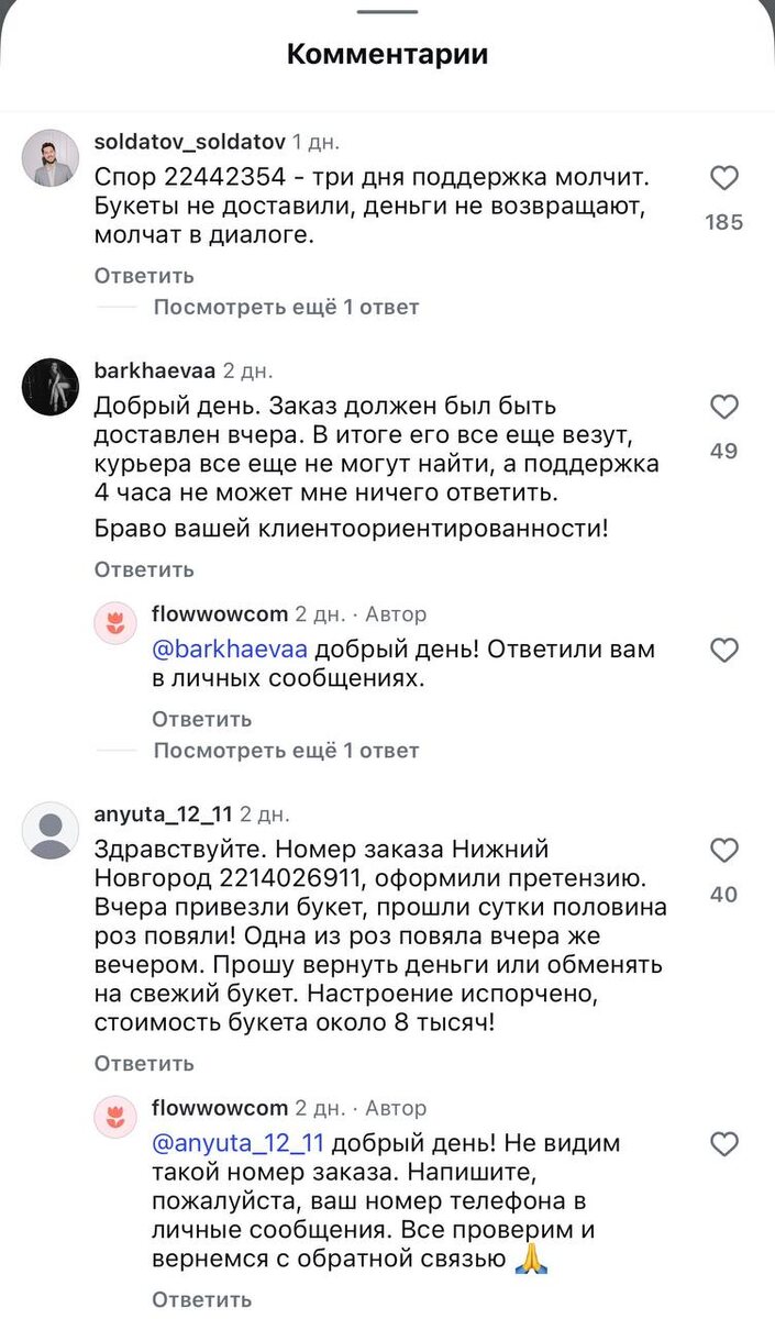 вспоминали). Но милых дам и флористов бомбит до сих пор, потому что их букеты не были доставлены в срок. Лавина хейтерских рилзов по этому поводу обрушилась на сервис «Флаувау». В лучшем случае доставку букета просто сильно задерживали, даже если заказ был сделан заранее. Некоторым клиентам доставляли букеты, которые отличались о того, чтобы было заявлено в карточке товара. В худшем случае — букет не доставляли, а служба поддержки молчала. Недовольные девушки записывают о подобных ситуациях ролики, а также оставляют гневные комментарии в запретграме «Флаувау». Столкнулись с подобной ситуацией 8 марта и Зина с Любой. Сервис при этом лишь выборочно отвечает на комментарии людей. Видимо, "Флаувау" некогда обращаться внимания на такие мелочи, ведь прямо сейчас она готовится к продаже Яндексу за 8 млрд рублей. Наверное, хотят убить сервис до того, как к этому приступят высокоэффективные менеджеры. В этом посте есть большое видео, которое не загрузилось в Дзен. Откройте оригинал поста в те