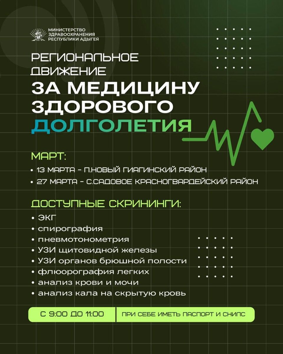! Региональное движение «За медицину здорового долголетия» стартовало в Адыгее в конце прошлого года, чтобы помочь людям сохранить здоровье и увеличить продолжительность жизни. Проект объединил медицину, культуру, СМИ, общественные организации и волонтёров. До конца марта участники движения посетят населённые пункты Красногвардейского района и станицы Гиагинской. Смотрите карточку 💬 Присоединяйтесь к проекту вместе с нами и будьте здоровы! 💬Минздрав Адыгеи в МАХ