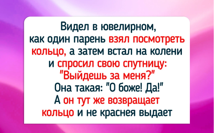 - Мы с женой были в ювелирном магазине и видели, как один парень взял посмотреть кольцо, затем встал на колени и спросил свою спутницу: «Выйдешь за меня?» Она такая: «О боже! Да!» А он берет и... возвращает кольцо продавцам. После чего заявляет, что просто хотел все сделать красиво, но денег у него нет. Девушка пришла в ярость и начала кричать: «Мама была права насчет тебя!» Не передать, как неприятно было на все это смотреть. © kemikiao