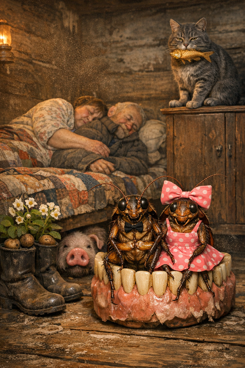 В избе Клавдии стоял такой храп, что кот Матвей на шкафу прижал уши, чтобы не оглохнуть. Клавдия и Никифор, уставшие после копки картошки и душевных посиделок, спали без задних ног. Они лежали вповалку, обнявшись, как два огромных уютных мешка. Никифор уткнулся носом в плечо хозяйки и тихонько посвистывал, а Клавдия в ответ выдавала такие рулады, что в серванте позвякивали стаканы. Таракан Егор, привязав себя усиком к ножке кровати, чтобы не снесло мощным выдохом Никифора, наконец-то приступил к долгожданному ужину.