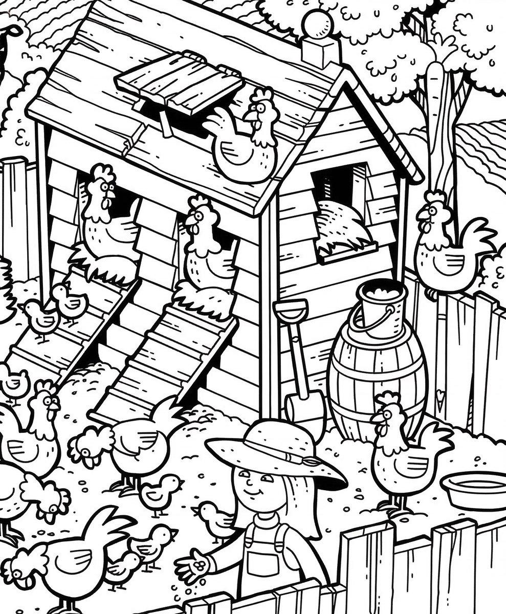 Перед вами иллюстрация из детской книги, которая может показаться обычной. На ней изображена девочка, кормящая кур во дворе. Однако, если присмотреться внимательнее, можно заметить, что на картине присутствуют не только куры. Здесь еще прячется карандаш, морковь, молоток, мяч, месяц, кисточка и даже хитрая овечка Смогли найти?